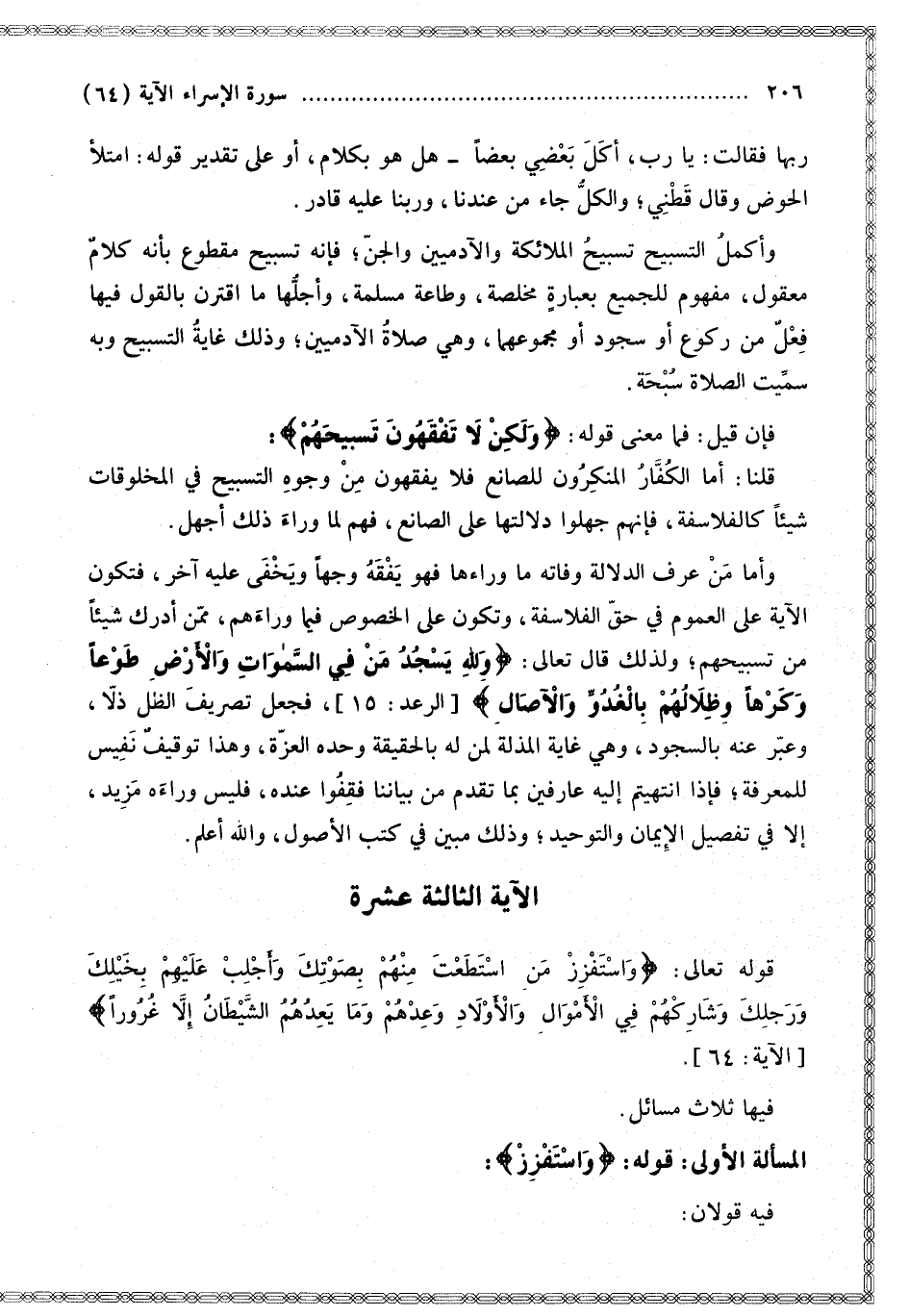 َ وَأَجْلِبْ عَلَيْهِمْ بِخَيْلِكَ وَرَجِلِكَ وَشَارِكْهُمْ فِي الأَمْوَالِ وَالأَوْلادِ وَعِدْهُمْ وَمَا يَعِدُهُمُ الشَّيْطَانُ إِلا غُرُورًا} [الإسراء: 64] فِيهَا ثَلَاثُ مَسَائِلَ