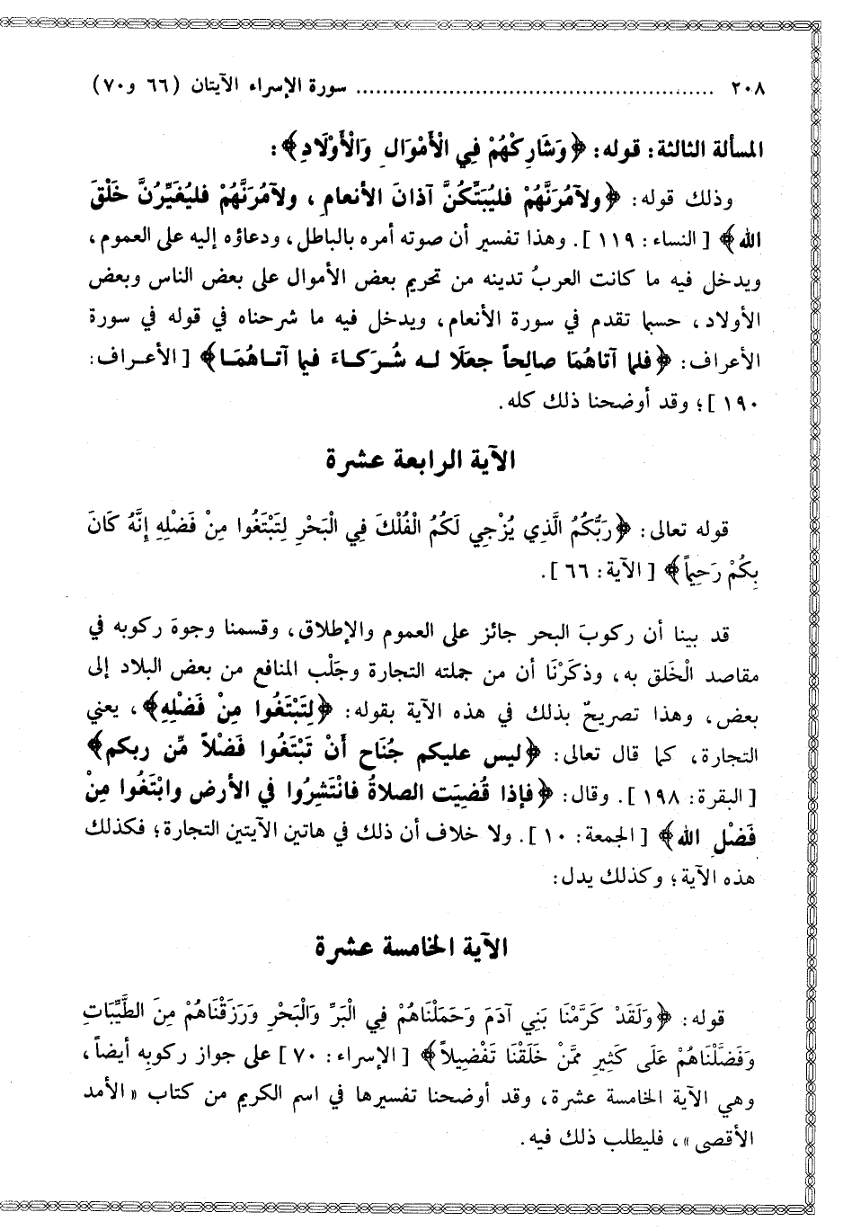 الْآيَةُ الْخَامِسَةَ عَشْرَةَ قَوْلُهُ: {وَلَقَدْ كَرَّمْنَا بَنِي آدَمَ وَحَمَلْنَاهُمْ فِي الْبَرِّ وَالْبَحْرِ وَرَزَقْنَاهُمْ مِنَ الطَّيِّبَاتِ وَفَضَّلْنَاهُمْ عَلَى كَثِيرٍ مِمَّنْ خَلَقْنَا تَفْضِيلا} [الإسراء: 70] عَلَى جَوَازِ رُكُوبِهِ أَيْضًا، وَهِيَ الْآيَةُ الْخَامِسَةَ عَشْرَةَ، وَقَدْ أَوْضَحْنَا تَفْسِيرَهَا فِي اسْمِ الْكَرِيمِ مِنْ كِتَابِ " الْأَمَدِ الْأَقْصَى " فَلْيُطْلَبْ ذَلِكَ فِيهِ.
