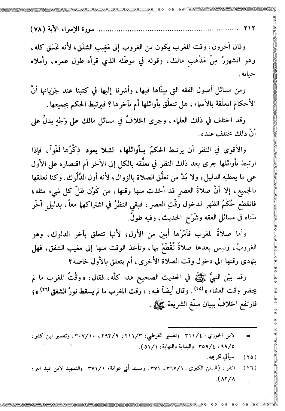 وَأَمَّا صَلَاةُ الْمَغْرِبِ فَأَمْرُهَا أَبْيَنُ مِنْ الْأَوَّلِ؛ لِأَنَّهَا تَتَعَلَّقُ بِآخِرِ الدُّلُوكِ، وَهُوَ الْغُرُوبُ، وَلَيْسَ بَعْدَهَا صَلَاةٌ تُقْطَعُ بِهَا، وَتَأْخُذُ الْوَقْتَ مِنْهَا إلَى مَغِيبِ الشَّفَقِ، فَهَلْ يَتَمَادَى وَقْتُهَا إلَى دُخُولِ وَقْتِ الصَّلَاةِ الْأُخْرَى، أَمْ يَتَعَلَّقُ بِالْأَوَّلِ خَاصَّةً؟ وَقَدْ بَيَّنَ النَّبِيُّ - صَلَّى اللَّهُ عَلَيْهِ وَسَلَّمَ - فِي الْحَدِيثِ الصَّحِيحِ هَذَا كُلَّهُ، فَقَالَ: «وَقْتُ الْمَغْرِبِ مَا لَمْ يَحْضُرْ وَقْتُ الْعِشَاءِ». وَقَالَ أَيْضًا فِيهِ: «وَقْتُ الْمَغْرِبِ مَا لَمْ يَسْقُطْ نُورُ الشَّفَقِ»؛ فَارْتَفَعَ الْخِلَافُ بِبَيَانِ مُبَلِّغِ الشَّرِيعَةِ.