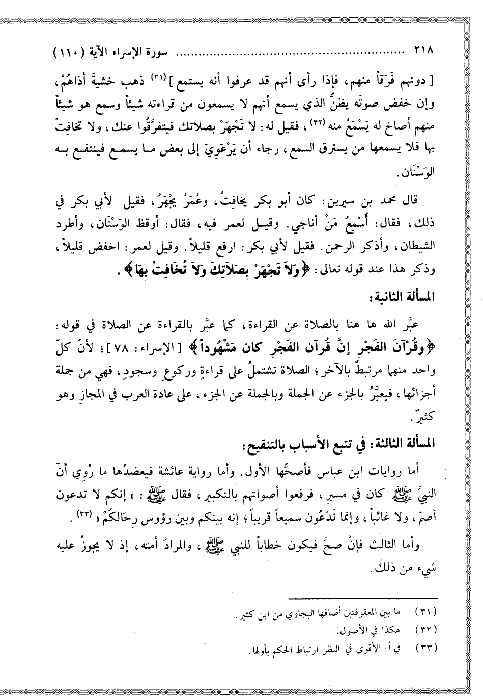 دُونَهُمْ فَرَقًا مِنْهُمْ، فَإِذَا رَأَى أَنَّهُمْ قَدْ عَرَفُوا أَنَّهُ يَسْتَمِعُ] ذَهَبَ خَشْيَةَ أَذَاهُمْ، وَإِنْ خَفَضَ صَوْتَهُ يَظُنُّ الَّذِي يَسْمَعُ أَنَّهُمْ لَا يَسْمَعُونَ مِنْ قِرَاءَتِهِ شَيْئًا وَسَمِعَ هُوَ شَيْئًا مِنْهُمْ أَصَاخَ لَهُ يَسْمَعُ مِنْهُ، فَقِيلَ لَهُ: لَا تَجْهَرْ بِصَلَاتِك فَيَتَفَرَّقُوا عَنْك، وَلَا تُخَافِتْ بِهَا فَلَا يَسْمَعُهَا مَنْ يَسْتَرِقُ السَّمْعَ، رَجَاءَ أَنْ يَرْعَوِيَ إلَى بَعْضِ مَا يَسْمَعُ فَيَنْتَفِعُ بِهِ الْوَسْنَانُ. قَالَ مُحَمَّدُ بْنُ سِيرِينَ: كَانَ أَبُو بَكْرٍ يُخَافِتُ، وَعُمَرُ يَجْهَرُ، فَقِيلَ لِأَبِي بَكْرٍ فِي ذَلِكَ، فَقَالَ: أُسْمِعُ مَنْ أُنَاجِي. وَقِيلَ لِعُمَرَ فِيهِ، فَقَالَ: أُوقِظُ الْوَسْنَانَ، وَأَطْرُدُ الشَّيْطَانَ، وَأَذْكُرُ الرَّحْمَنَ. فَقِيلَ لِأَبِي بَكْرٍ: ارْفَعْ قَلِيلًا. وَقِيلَ لِعُمَرَ: اخْفِضْ قَلِيلًا، وَذَكَرَ هَذَا عِنْدَ قَوْله تَعَالَى: {وَلا تَجْهَرْ بِصَلاتِكَ وَلا تُخَافِتْ بِهَا} [الإسراء: 110].