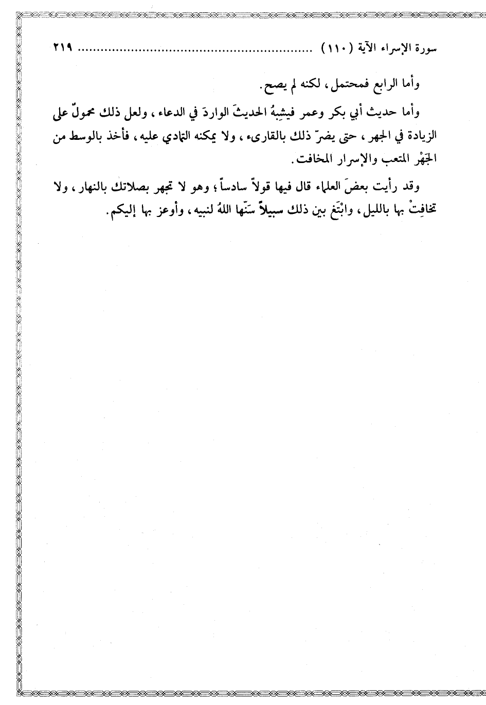 وَقَدْ رَأَيْت بَعْضَ الْعُلَمَاءِ قَالَ فِيهَا قَوْلًا سَادِسًا؛ وَهُوَ لَا تَجْهَرْ بِصَلَاتِك بِالنَّهَارِ وَلَا تُخَافِتْ بِهَا بِاللَّيْلِ، وَابْتَغِ بَيْنَ ذَلِكَ سَبِيلًا سَنَّهَا اللَّهُ لِنَبِيِّهِ وَأَوْعَزَ بِهَا إلَيْكُمْ.