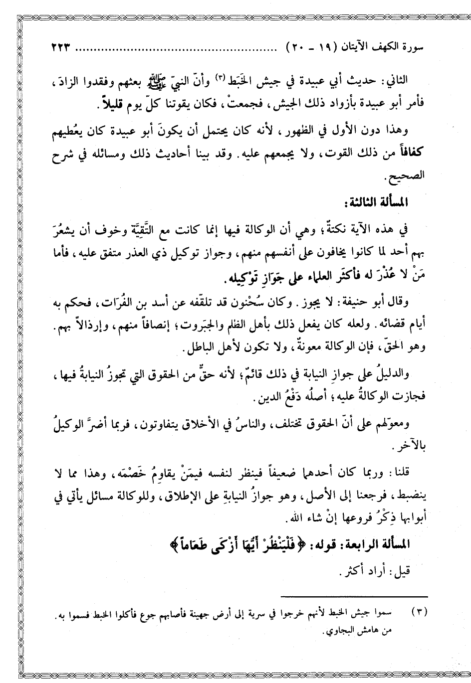 فِي هَذِهِ الْآيَةِ نُكْتَةٌ وَهِيَ أَنَّ الْوَكَالَةَ فِيهَا إنَّمَا كَانَتْ مَعَ التَّقِيَّةِ وَخَوْفِ أَنْ يَشْعُرَ بِهِمْ أَحَدٌ لَمَّا كَانُوا يَخَافُونَ عَلَى أَنْفُسِهِمْ مِنْهُمْ، وَجَوَازُ تَوْكِيلِ ذِي الْعُذْرِ مُتَّفَقٌ عَلَيْهِ، فَأَمَّا مَنْ لَا عُذْرَ لَهُ فَأَكْثَرُ الْعُلَمَاءِ عَلَى جَوَازِ تَوْكِيلِهِ.
