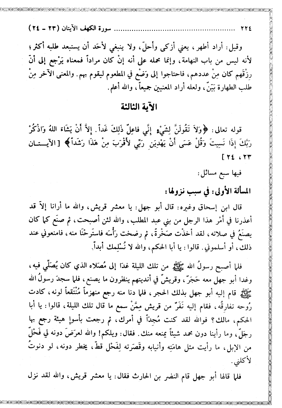 قَوْله تَعَالَى: {وَلا تَقُولَنَّ لِشَيْءٍ إِنِّي فَاعِلٌ ذَلِكَ غَدًا - إِلا أَنْ يَشَاءَ اللَّهُ وَاذْكُرْ رَبَّكَ إِذَا نَسِيتَ وَقُلْ عَسَى أَنْ يَهْدِيَنِي رَبِّي لأَقْرَبَ مِنْ هَذَا رَشَدًا} [الكهف: 23 - 24] فِيهَا سَبْعُ مَسَائِلَ: