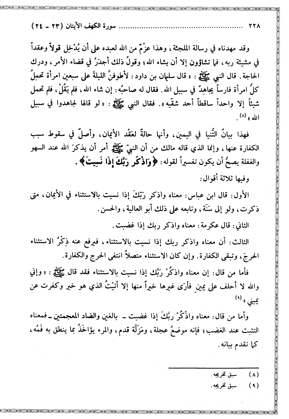 وَقَدْ مَهَّدْنَاهُ فِي رِسَالَةِ الْمُلْجِئَةِ، وَهَذَا عَزْمٌ مِنْ اللَّهِ لِعَبْدِهِ عَلَى أَنْ يُدْخِلَ قَوْلًا وَعَقْدًا فِي مَشِيئَةِ رَبِّهِ، فَمَا تَشَاءُونَ إلَّا أَنْ يَشَاءَ اللَّهُ؛ وَقَوْلُ ذَلِكَ أَجْدَرُ فِي قَضَاءِ الْأَمْرِ، وَدَرْكِ الْحَاجَةِ. قَالَ النَّبِيُّ - صَلَّى اللَّهُ عَلَيْهِ وَسَلَّمَ -: «قَالَ سُلَيْمَانُ بْنُ دَاوُد: لَأَطُوفَنَّ اللَّيْلَةَ عَلَى سَبْعِينَ امْرَأَةً تَحْمِلُ كُلُّ امْرَأَةٍ فَارِسًا يُجَاهِدُ فِي سَبِيلِ اللَّهِ. فَقَالَ لَهُ صَاحِبُهُ: إنْ شَاءَ اللَّهُ، فَلَمْ يَقُلْ، فَلَمْ تَحْمِلْ شَيْئًا إلَّا وَاحِدًا سَاقِطًا أَحَدُ شِقَّيْهِ. فَقَالَ النَّبِيُّ - صَلَّى اللَّهُ عَلَيْهِ وَسَلَّمَ -: لَوْ قَالَهَا لَجَاهَدُوا فِي سَبِيلِ اللَّهِ».
