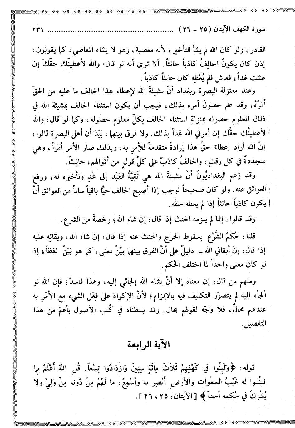 الْآيَةُ الرَّابِعَةُ: قَوْلُهُ: {وَلَبِثُوا فِي كَهْفِهِمْ ثَلاثَ مِائَةٍ سِنِينَ وَازْدَادُوا تِسْعًا - قُلِ اللَّهُ أَعْلَمُ بِمَا لَبِثُوا لَهُ غَيْبُ السَّمَاوَاتِ وَالأَرْضِ أَبْصِرْ بِهِ وَأَسْمِعْ مَا لَهُمْ مِنْ دُونِهِ مِنْ وَلِيٍّ وَلا يُشْرِكُ فِي حُكْمِهِ أَحَدًا} [الكهف: 25 - 26].