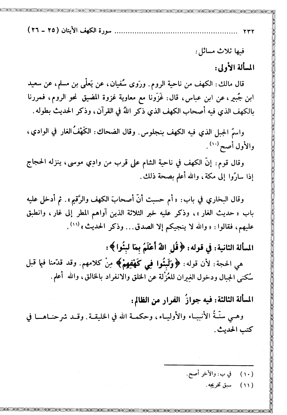 الْمَسْأَلَةُ الْأُولَى: قَالَ مَالِكٌ: الْكَهْفُ مِنْ نَاحِيَةِ الرُّومِ. وَرَوَى سُفْيَانُ عَنْ يَعْلَى بْنِ مُسْلِمٍ عَنْ سَعِيدِ بْنِ جُبَيْرٍ عَنْ ابْنِ عَبَّاسٍ قَالَ: غَزَوْنَا مَعَ مُعَاوِيَةَ غَزْوَةَ الْمَضِيقِ نَحْوَ الرُّومِ، فَمَرَرْنَا بِالْكَهْفِ الَّذِي فِيهِ أَصْحَابُ الْكَهْفِ الَّذِي ذَكَرَ اللَّهُ فِي الْقُرْآنِ، وَذَكَرَ الْحَدِيثَ بِطُولِهِ.