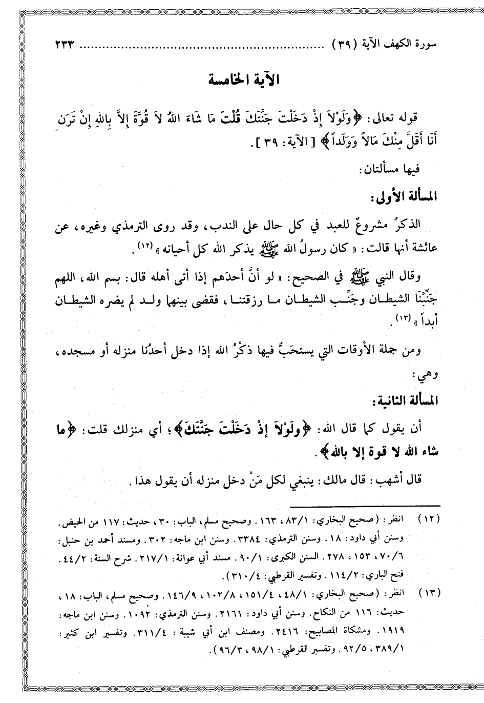 الْمَسْأَلَةُ الثَّانِيَةُ: أَنْ يَقُولَ كَمَا قَالَ اللَّهُ: {وَلَوْلا إِذْ دَخَلْتَ جَنَّتَكَ} [الكهف: 39] أَيْ مَنْزِلَك قُلْت: {مَا شَاءَ اللَّهُ لا قُوَّةَ إِلا بِاللَّهِ} [الكهف: 39]. قَالَ أَشْهَبُ: قَالَ مَالِكٌ: يَنْبَغِي لِكُلِّ مَنْ دَخَلَ مَنْزِلَهُ أَنْ يَقُولَ هَذَا.
