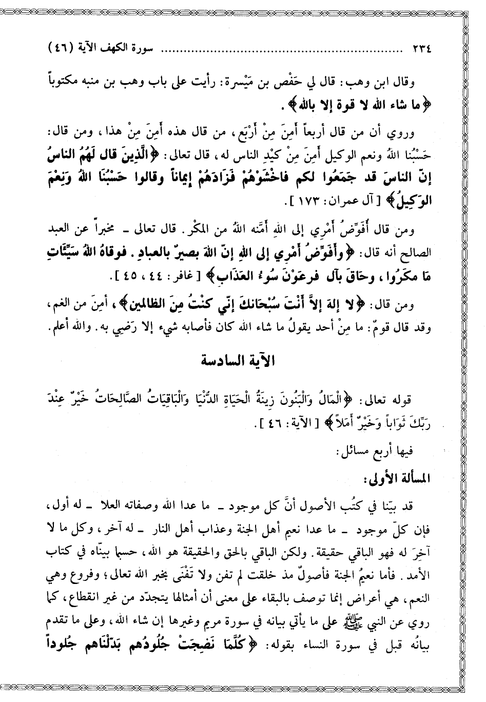 وَالْبَاقِيَاتُ الصَّالِحَاتُ خَيْرٌ عِنْدَ رَبِّكَ ثَوَابًا وَخَيْرٌ أَمَلا} [الكهف: 46]. فِيهَا أَرْبَعُ مَسَائِلَ: