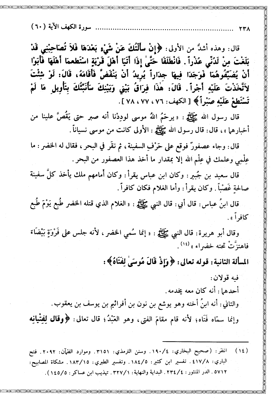 قَالَ: وَجَاءَ عُصْفُورٌ فَوَقَعَ عَلَى حَرْفِ السَّفِينَةِ، ثُمَّ نَقَرَ فِي الْبَحْرِ، فَقَالَ لَهُ الْخَضِرُ: مَا عِلْمِي وَعِلْمُك فِي عِلْمِ اللَّهِ إلَّا بِمِقْدَارِ مَا أَخَذَ هَذَا الْعُصْفُورُ مِنْ الْبَحْرِ. قَالَ سَعِيدُ بْنُ جُبَيْرٍ: وَكَانَ ابْنُ عَبَّاسٍ يَقْرَأُ: وَكَانَ أَمَامَهُمْ مَلِكٌ يَأْخُذُ كُلَّ سَفِينَةٍ صَالِحَةٍ غَصْبًا. وَكَانَ يَقْرَأُ: وَأَمَّا الْغُلَامُ فَكَانَ كَافِرًا. قَالَ ابْنُ عَبَّاسٍ: قَالَ أُبَيٌّ: قَالَ النَّبِيُّ - صَلَّى اللَّهُ عَلَيْهِ وَسَلَّمَ -: «الْغُلَامُ الَّذِي قَتَلَهُ الْخَضِرُ طُبِعَ يَوْمَ طُبِعَ كَافِرًا». وَقَالَ أَبُو هُرَيْرَةَ: قَالَ النَّبِيُّ - صَلَّى اللَّهُ عَلَيْهِ وَسَلَّمَ -: «إنَّمَا سُمِّيَ الْخَضِرُ؛ لِأَنَّهُ جَلَسَ عَلَى فَرْوَةٍ بَيْضَاءَ فَاهْتَزَّتْ تَحْتَهُ خَضْرَاءَ».