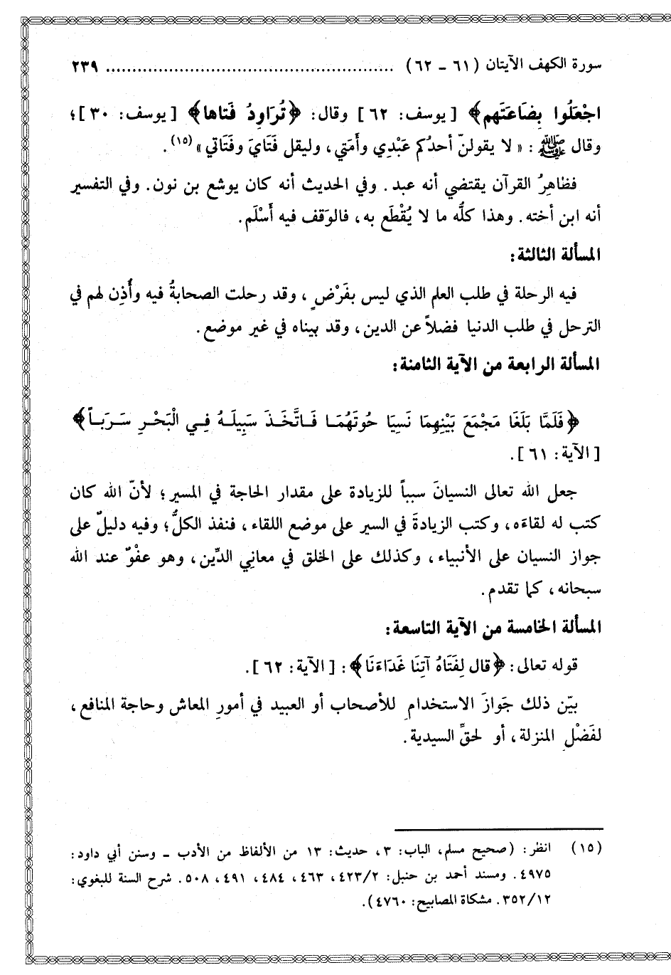 {تُرَاوِدُ فَتَاهَا} [يوسف: 30] وَقَالَ - صَلَّى اللَّهُ عَلَيْهِ وَسَلَّمَ -: «لَا يَقُولَنَّ أَحَدُكُمْ عَبْدِي وَأَمَتِي، وَلْيَقُلْ فَتَايَ وَفَتَاتِي». فَظَاهِرُ الْقُرْآنِ يَقْتَضِي أَنَّهُ عَبْدٌ. وَفِي الْحَدِيثِ أَنَّهُ كَانَ يُوشَعُ بْنُ نُونٍ. وَفِي التَّفْسِيرِ أَنَّهُ ابْنُ أُخْتِهِ. وَهَذَا كُلُّهُ مَا لَا يُقْطَعُ بِهِ، فَالْوَقْفُ فِيهِ أَسْلَمُ.