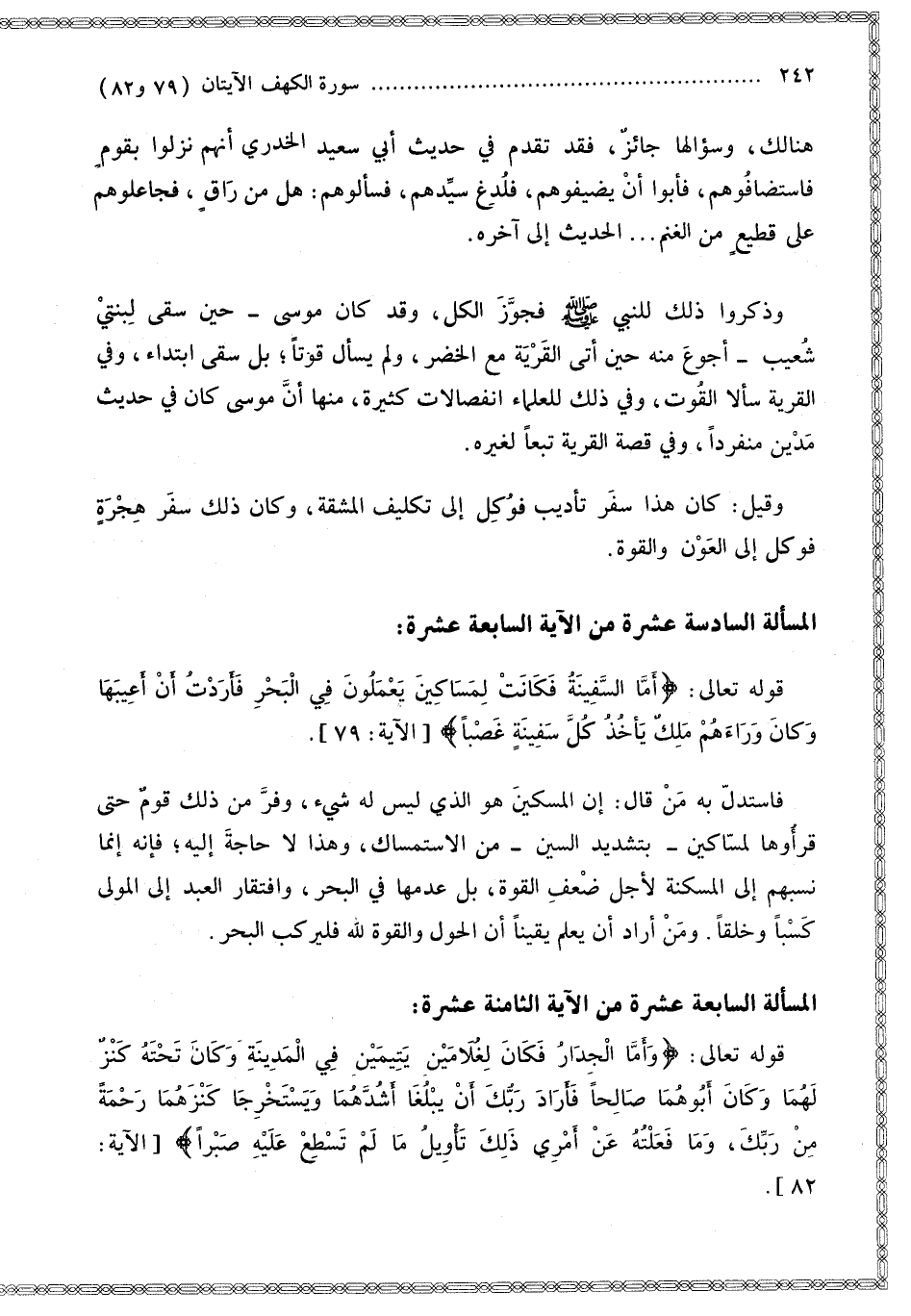 ِ فَأَرَدْتُ أَنْ أَعِيبَهَا وَكَانَ وَرَاءَهُمْ مَلِكٌ يَأْخُذُ كُلَّ سَفِينَةٍ غَصْبًا} [الكهف: 79]. فَاسْتَدَلَّ بِهِ مَنْ قَالَ: إنَّ الْمِسْكِينَ هُوَ الَّذِي لَيْسَ لَهُ شَيْءٌ، وَفَرَّ مِنْ ذَلِكَ قَوْمٌ حَتَّى قَرَءُوهَا لِمَسَّاكِينَ بِتَشْدِيدِ السِّينِ مِنْ الِاسْتِمْسَاكِ، وَهَذَا لَا حَاجَةَ إلَيْهِ؛ فَإِنَّهُ إنَّمَا نَسَبَهُمْ إلَى الْمَسْكَنَةِ لِأَجْلِ ضَعْفِ الْقُوَّةِ، بَلْ عَدَمِهَا فِي الْبَحْرِ، وَافْتِقَارِ الْعَبْدِ إلَى الْمَوْلَى كَسْبًا وَخَلْقًا. وَمَنْ أَرَادَ أَنْ يَعْلَمَ يَقِينًا أَنَّ الْحَوْلَ وَالْقُوَّةَ لِلَّهِ فَلْيَرْكَبْ الْبَحْرَ.