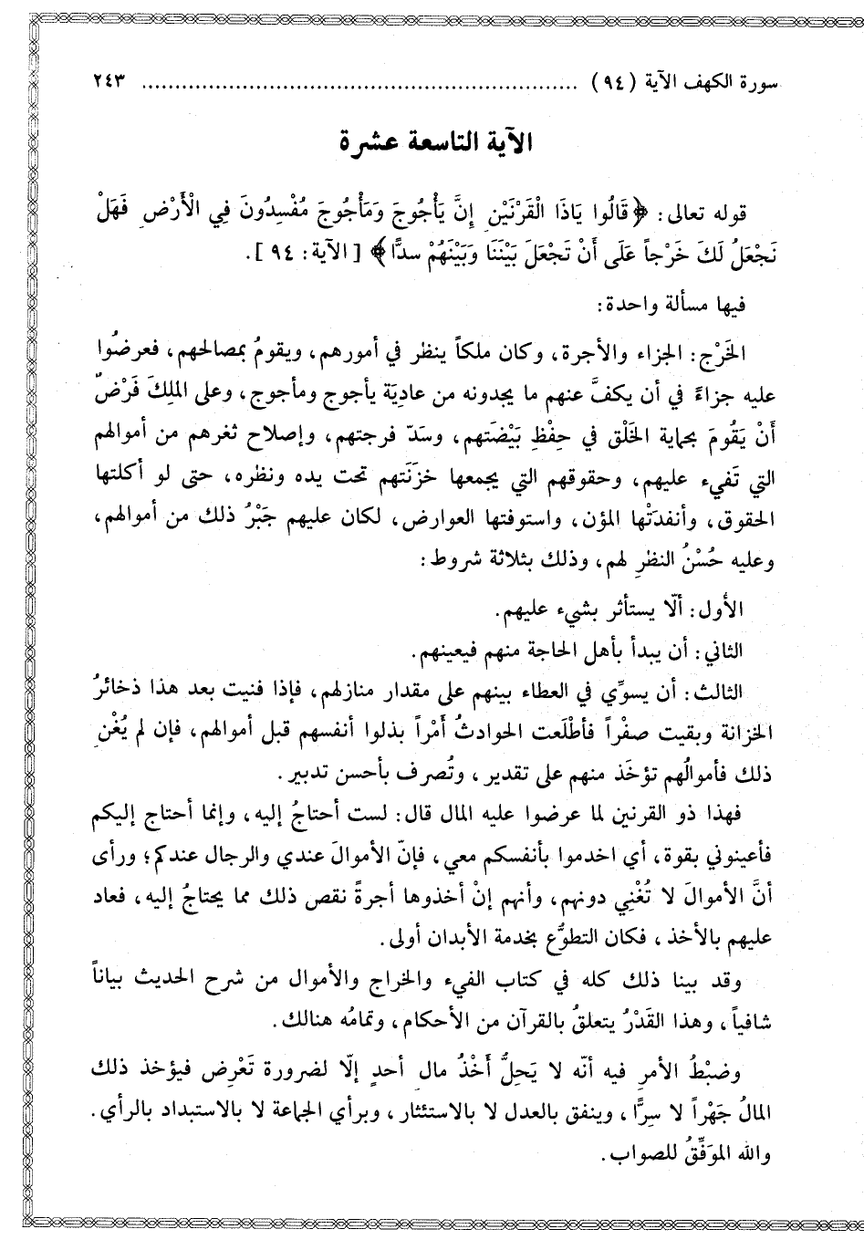 فِيهَا مَسْأَلَةٌ وَاحِدَةٌ: الْخَرْجُ: الْجَزَاءُ وَالْأُجْرَةُ، وَكَانَ مَلِكًا يَنْظُرُ فِي أُمُورِهِمْ، وَيَقُومُ بِمَصَالِحِهِمْ، فَعَرَضُوا عَلَيْهِ جَزَاءً فِي أَنْ يَكُفَّ عَنْهُمْ مَا يَجِدُونَهُ مِنْ عَادِيَةِ يَأْجُوجَ وَمَأْجُوجَ، وَعَلَى الْمَلِكِ فَرْضُ أَنْ يَقُومَ بِحِمَايَةِ الْخَلْقِ فِي حِفْظِ بَيْضَتِهِمْ، وَسَدِّ فُرْجَتِهِمْ، وَإِصْلَاحِ ثَغْرِهِمْ مِنْ أَمْوَالِهِمْ الَّتِي تَفِيءُ عَلَيْهِمْ، وَحُقُوقِهِمْ الَّتِي يَجْمَعُهَا خَزَنَتُهُمْ تَحْتَ يَدِهِ وَنَظَرِهِ، حَتَّى لَوْ أَكْلَتهَا الْحُقُوقُ، وَأَنْفَدَتْهَا الْمُؤَنُ، وَاسْتَوْفَتْهَا الْعَوَارِضُ، لَكَانَ عَلَيْهِمْ جَبْرُ ذَلِكَ مِنْ أَمْوَالِهِمْ، وَعَلَيْهِ حُسْنُ النَّظَرِ لَهُمْ، وَذَلِكَ بِثَلَاثَةِ شُرُوطٍ: