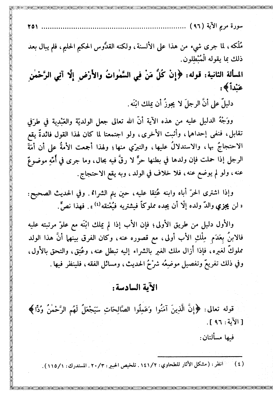 الْمَسْأَلَةُ الثَّانِيَةُ: قَوْلُهُ: {إِنْ كُلُّ مَنْ فِي السَّمَاوَاتِ وَالأَرْضِ إِلا آتِي الرَّحْمَنِ عَبْدًا} [مريم: 93] دَلِيلٌ عَلَى أَنَّ الرَّجُلَ لَا يَجُوزُ أَنْ يَمْلِكَ ابْنَهُ وَوَجْهُ الدَّلِيلِ عَلَيْهِ مِنْ هَذِهِ الْآيَةِ أَنَّ اللَّهَ تَعَالَى جَعَلَ الْوَلَدِيَّةَ وَالْعَبْدِيَّةَ فِي طَرَفَيْ تَقَابُلٍ، فَنَفَى إحْدَاهُمَا، وَأَثْبَتَ الْأُخْرَى، وَلَوْ اجْتَمَعَتَا لَمَا كَانَ لِهَذَا الْقَوْلِ فَائِدَةٌ يَقَعُ الِاحْتِجَاجُ بِهَا، وَالِاسْتِدْلَالُ عَلَيْهَا، وَالتَّبَرِّي مِنْهَا؛ وَلِهَذَا أَجْمَعَتْ الْأُمَّةُ عَلَى أَنَّ أَمَةَ الرَّجُلِ إذَا حَمَلَتْ فَإِنَّ وَلَدَهَا فِي بَطْنِهَا حُرٌّ لَا رِقَّ فِيهِ بِحَالٍ، وَمَا جَرَى فِي أُمِّهِ مَوْضُوعٌ عَنْهُ، وَلَوْ لَمْ يُوضَعْ عَنْهُ، فَلَا خِلَافَ فِي الْوَلَدِ، وَبِهِ يَقَعُ الِاحْتِجَاجُ.