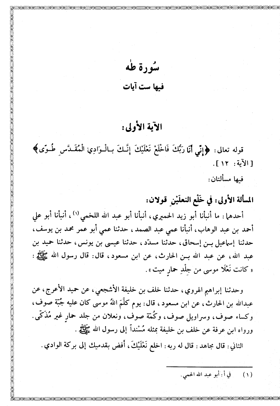 أَحَدُهُمَا: مَا أَنْبَأَنَا أَبُو زَيْدٍ الْحِمْيَرِيُّ، أَنْبَأَنَا أَبُو عَبْدِ اللَّهِ اللَّخْمِيُّ، أَنْبَأَنَا أَبُو عَلِيٍّ أَحْمَدَ بْنُ عَبْدِ الْوَهَّابِ، أَنْبَأَنَا عَمِّي عَبْدُ الصَّمَدِ، حَدَّثَنَا عَمِّي أَبُو عُمَرَ مُحَمَّدُ بْنُ يُوسُفَ، حَدَّثَنَا إسْمَاعِيلَ بْنِ إِسْحَاقَ، حَدَّثَنَا مُسَدَّدٌ، حَدَّثَنَا عِيسَى بْنُ يُونُسَ، حَدَّثَنَا حُمَيْدُ بْنُ عَبْدِ اللَّهِ عَنْ عَبْدِ اللَّهِ بْنِ الْحَارِثِ عَنْ ابْنِ مَسْعُودٍ قَالَ: قَالَ رَسُولُ اللَّهِ - صَلَّى اللَّهُ عَلَيْهِ وَسَلَّمَ -: «كَانَتْ نَعْلَا مُوسَى مِنْ جِلْدِ حِمَارٍ مَيِّتٍ».
