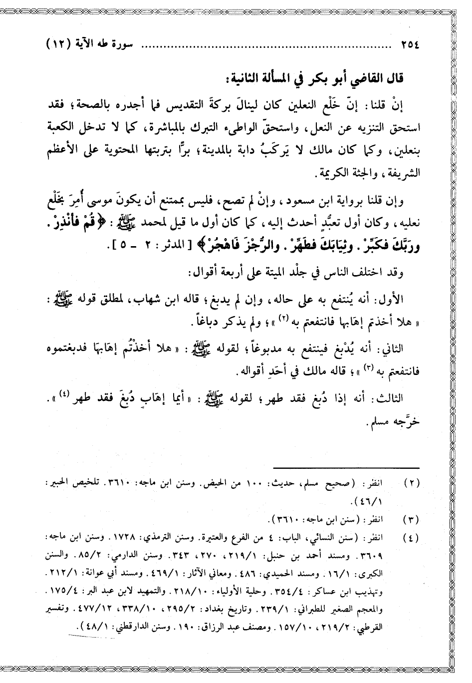 وَقَدْ اخْتَلَفَ النَّاسُ فِي جِلْدِ الْمَيْتَةِ عَلَى أَرْبَعَةِ أَقْوَالٍ: