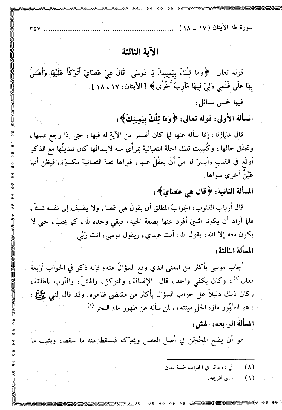 } [طه: 17] {قَالَ هِيَ عَصَايَ أَتَوَكَّأُ عَلَيْهَا وَأَهُشُّ بِهَا عَلَى غَنَمِي وَلِيَ فِيهَا مَآرِبُ أُخْرَى} [طه: 18]. فِيهَا خَمْسُ مَسَائِلَ: