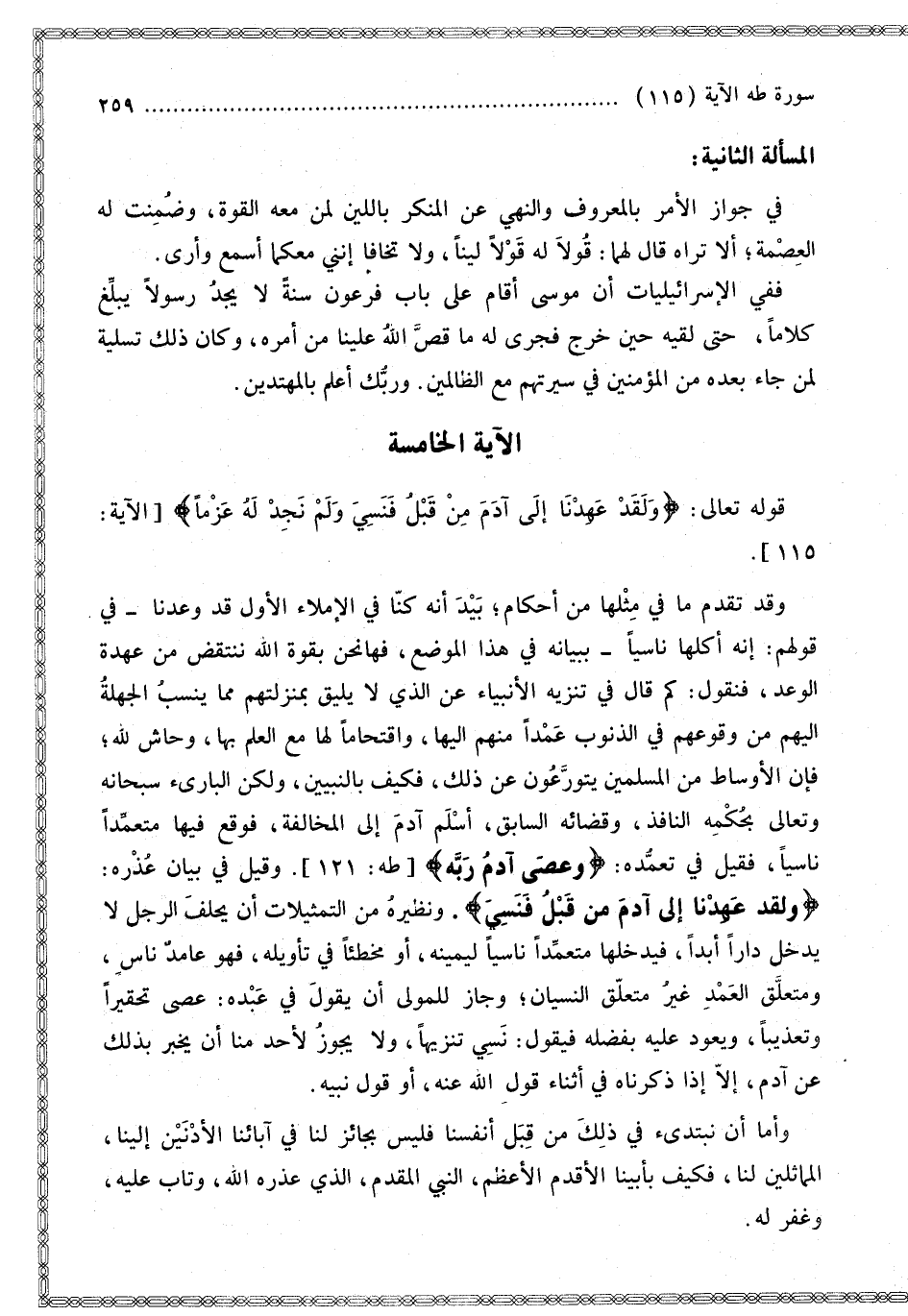 } [طه: 115]. وَقَدْ تَقَدَّمَ مَا فِي مِثْلِهَا مِنْ أَحْكَامٍ؛ بَيْدَ أَنَّهُ كُنَّا فِي الْإِمْلَاءِ الْأَوَّلِ قَدْ وَعَدْنَا فِي قَوْلِهِمْ: إنَّهُ أَكَلَهَا نَاسِيًا بِبَيَانِهِ فِي هَذَا الْمَوْضِعِ، فَهَا نَحْنُ بِقُوَّةِ اللَّهِ نَنْتَقِضُ مِنْ عُهْدَةِ الْوَعْدِ، فَنَقُولُ: كَمَا قَالَ فِي تَنْزِيهِ الْأَنْبِيَاءِ عَنْ الَّذِي لَا يَلِيقُ بِمَنْزِلَتِهِمْ مِمَّا يَنْسِبُ الْجَهَلَةُ إلَيْهِمْ مِنْ وُقُوعِهِمْ فِي الذُّنُوبِ عَمْدًا مِنْهُمْ إلَيْهَا، وَاقْتِحَامًا لَهَا مَعَ الْعِلْمِ بِهَا، وَحَاشَ لِلَّهِ، فَإِنَّ الْأَوْسَاطَ مِنْ الْمُسْلِمِينَ يَتَوَرَّعُونَ عَنْ ذَلِكَ، فَكَيْفَ بِالنَّبِيِّينَ، وَلَكِنَّ الْبَارِئَ سُبْحَانَهُ وَتَعَالَى بِحُكْمِهِ النَّافِذِ، وَقَضَائِهِ السَّابِقِ، أَسْلَمَ آدَمَ إلَى الْمُخَالَفَةِ، فَوَقَعَ فِيهَا مُتَعَمِّدًا نَاسِيًا، فَقِيلَ فِي تَعَمُّدِهِ: {وَعَصَى آدَمُ رَبَّهُ} [طه: 121].
