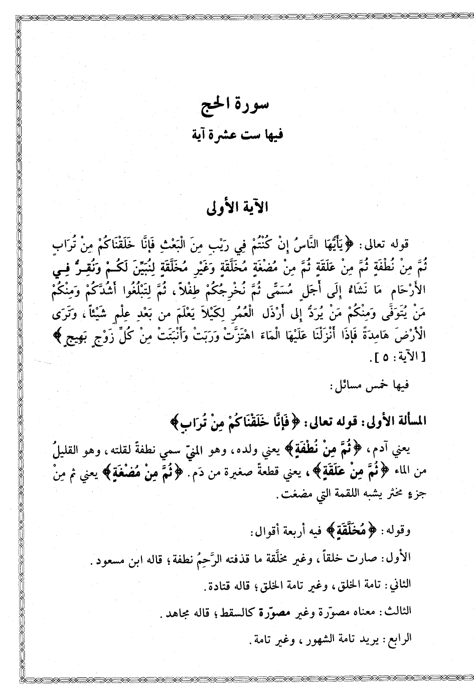 الْمَسْأَلَةُ الْأُولَى: قَوْله تَعَالَى: {فَإِنَّا خَلَقْنَاكُمْ مِنْ تُرَابٍ} [الحج: 5] يَعْنِي آدَمَ، {ثُمَّ مِنْ نُطْفَةٍ} [الحج: 5] يَعْنِي وَلَدَهُ، وَهُوَ الْمَنِيُّ سُمِّيَ نُطْفَةً لِقِلَّتِهِ، وَهُوَ الْقَلِيلُ مِنْ الْمَاءِ {ثُمَّ مِنْ عَلَقَةٍ} [الحج: 5] يَعْنِي قِطْعَةً صَغِيرَةً مِنْ دَمٍ. {ثُمَّ مِنْ مُضْغَةٍ} [الحج: 5] يَعْنِي ثُمَّ مِنْ جُزْءٍ مُخَثَّرٍ يُشْبِهُ اللُّقْمَةَ الَّتِي مُضِغَتْ.