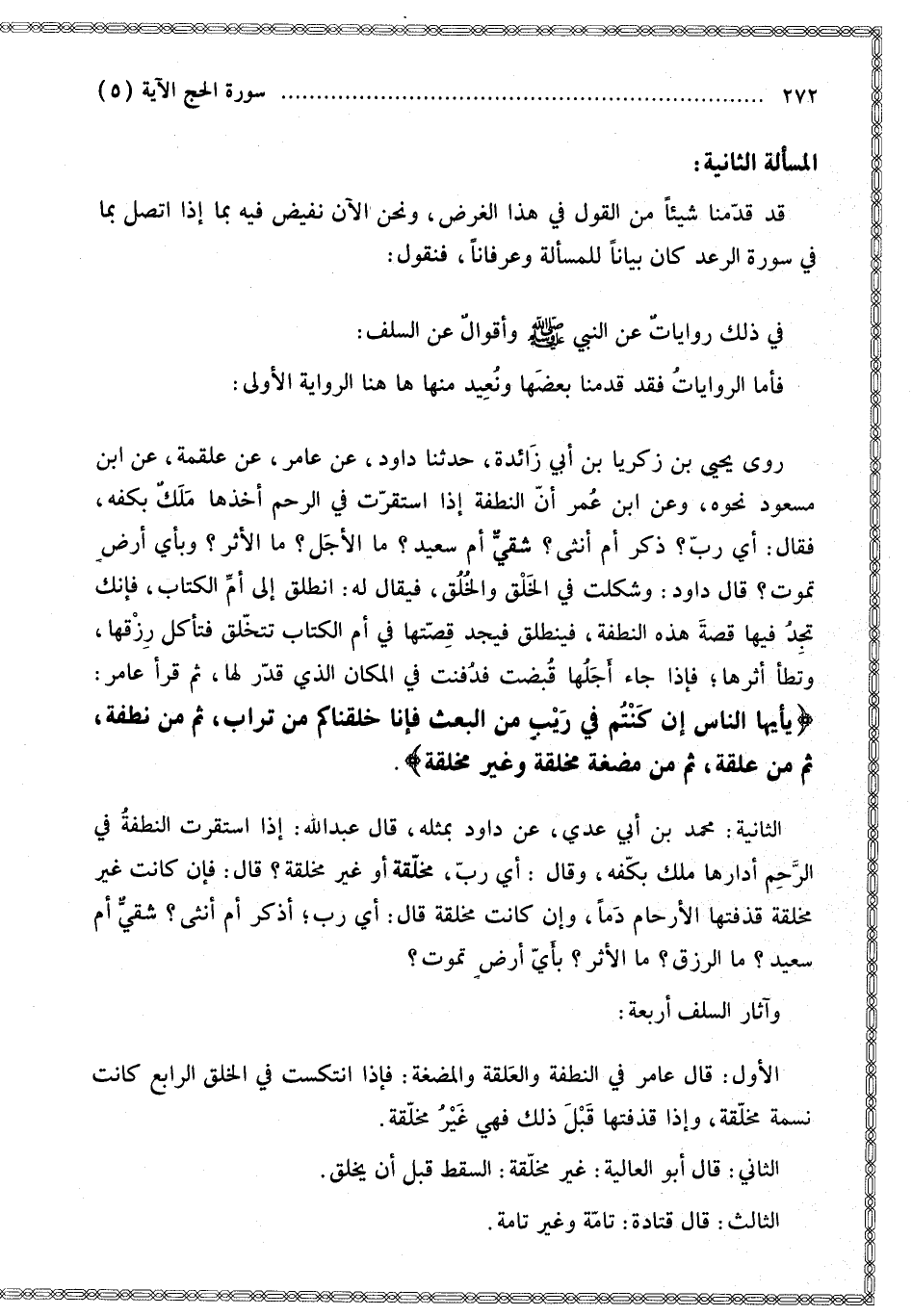 الثَّانِيَةُ: مُحَمَّدُ بْنُ أَبِي عَدِيٍّ عَنْ دَاوُد بِمِثْلِهِ، قَالَ عَبْدُ اللَّهِ: إذَا اسْتَقَرَّتْ النُّطْفَةُ فِي الرَّحِمِ أَدَارَهَا مَلَكٌ بِكَفِّهِ، وَقَالَ: أَيْ رَبِّ، مُخَلَّقَةٌ أَوْ غَيْرُ مُخَلَّقَةٍ؟ قَالَ: فَإِنْ كَانَتْ غَيْرَ مُخَلَّقَةٍ قَذَفَتْهَا الْأَرْحَامُ دَمًا، وَإِنْ كَانَتْ مُخَلَّقَةً قَالَ: أَيْ رَبِّ، أَذَكَرٌ أَمْ أُنْثَى؟ شَقِيٌّ أَمْ سَعِيدٌ؟ مَا الرِّزْقُ؟ مَا الْأَثَرُ؟ بِأَيِّ أَرْضٍ تَمُوتُ؟ وَآثَارُ السَّلَفِ أَرْبَعَةٌ: الْأَوَّلُ: قَالَ عَامِرٌ فِي النُّطْفَةِ وَالْعَلَقَةِ وَالْمُضْغَةِ: فَإِذَا انْتَكَسَتْ فِي الْخَلْقِ الرَّابِعِ كَانَتْ نَسَمَةً مُخَلَّقَةً، وَإِذَا قَذَفَتْهَا قَبْلَ ذَلِكَ فَهِيَ غَيْرُ مُخَلَّقَةٍ.