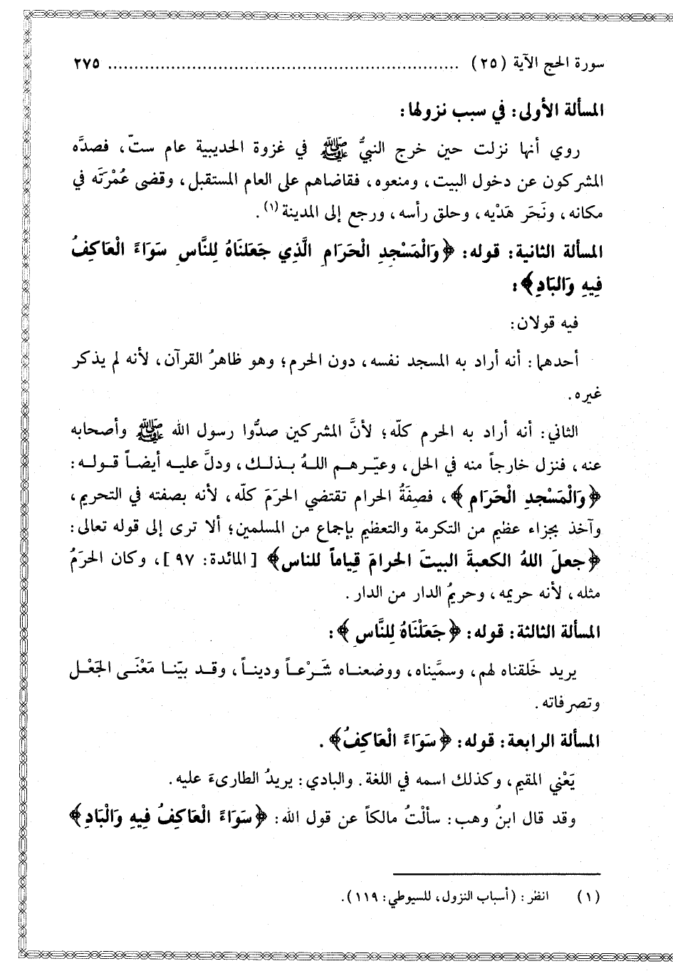 الثَّانِي: أَنَّهُ أَرَادَ بِهِ الْحَرَمَ كُلَّهُ؛ لِأَنَّ الْمُشْرِكِينَ صَدُّوا رَسُولَ اللَّهِ - صَلَّى اللَّهُ عَلَيْهِ وَسَلَّمَ - وَأَصْحَابَهُ عَنْهُ، فَنَزَلَ خَارِجًا مِنْهُ فِي الْحِلِّ، وَعَيَّرَهُمْ اللَّهُ بِذَلِكَ، وَدَلَّ عَلَيْهِ أَيْضًا قَوْلُهُ: {وَالْمَسْجِدِ الْحَرَامِ} [الحج: 25]، فَصِفَةُ الْحَرَامِ تَقْتَضِي الْحَرَمَ كُلَّهُ،؛ لِأَنَّهُ بِصِفَتِهِ فِي التَّحْرِيمِ، وَآخِذٌ بِجَزَاءٍ عَظِيمٍ مِنْ التَّكْرِمَةِ وَالتَّعْظِيمِ بِإِجْمَاعٍ مِنْ الْمُسْلِمِينَ؛ أَلَا تَرَى إلَى قَوْله تَعَالَى: {جَعَلَ اللَّهُ الْكَعْبَةَ الْبَيْتَ الْحَرَامَ قِيَامًا لِلنَّاسِ} [المائدة: 97]، وَكَانَ الْحَرَمُ مِثْلَهُ؛ لِأَنَّهُ حَرِيمُهُ، وَحَرِيمُ الدَّارِ مِنْ الدَّارِ.
