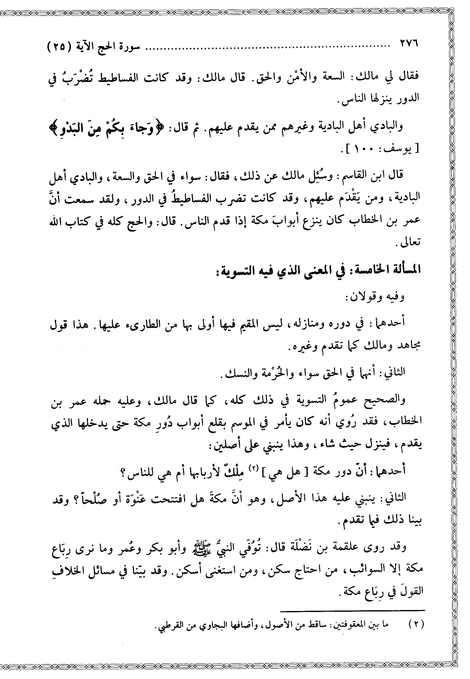 وَالصَّحِيحُ عُمُومُ التَّسْوِيَةِ فِي ذَلِكَ كُلِّهِ، كَمَا قَالَ مَالِكٌ، وَعَلَيْهِ حَمَلَهُ عُمَرُ بْنُ الْخَطَّابِ، فَقَدْ رُوِيَ أَنَّهُ كَانَ يَأْمُرُ فِي الْمَوْسِمِ بِقَلْعِ أَبْوَابِ دُورِ مَكَّةَ حَتَّى يَدْخُلَهَا الَّذِي يَقْدُمُ، فَيَنْزِلُ حَيْثُ شَاءَ، وَهَذَا يَنْبَنِي عَلَى أَصْلَيْنِ: أَحَدُهُمَا: أَنَّ دُورَ مَكَّةَ [هَلْ هِيَ] مِلْكٌ لِأَرْبَابِهَا أَمْ هِيَ لِلنَّاسِ؟ الثَّانِي: يَنْبَنِي عَلَيْهِ هَذَا الْأَصْلُ، وَهُوَ أَنَّ مَكَّةَ هَلْ اُفْتُتِحَتْ عَنْوَةً أَوْ صُلْحًا؟ وَقَدْ بَيَّنَّا ذَلِكَ فِيمَا تَقَدَّمَ.