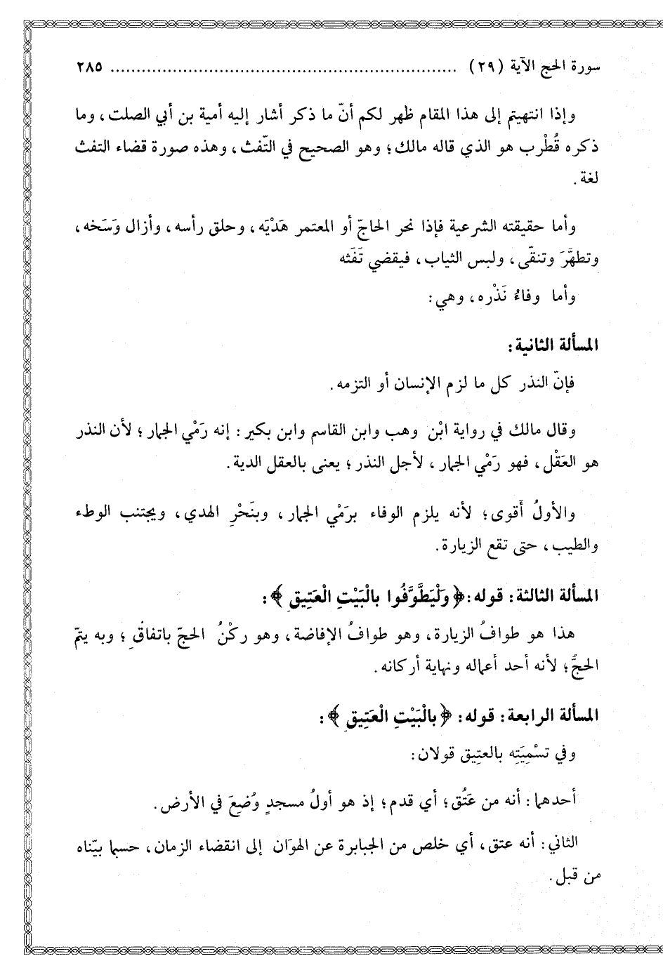 الْمَسْأَلَةُ الرَّابِعَةُ: قَوْلُهُ: {بِالْبَيْتِ الْعَتِيقِ} [الحج: 29]: وَفِي تَسْمِيَتِهِ بِالْعَتِيقِ قَوْلَانِ: أَحَدُهُمَا: أَنَّهُ مِنْ عَتُقَ أَيْ قَدُمَ؛ إذْ هُوَ أَوَّلُ مَسْجِدٍ وُضِعَ فِي الْأَرْضِ.
