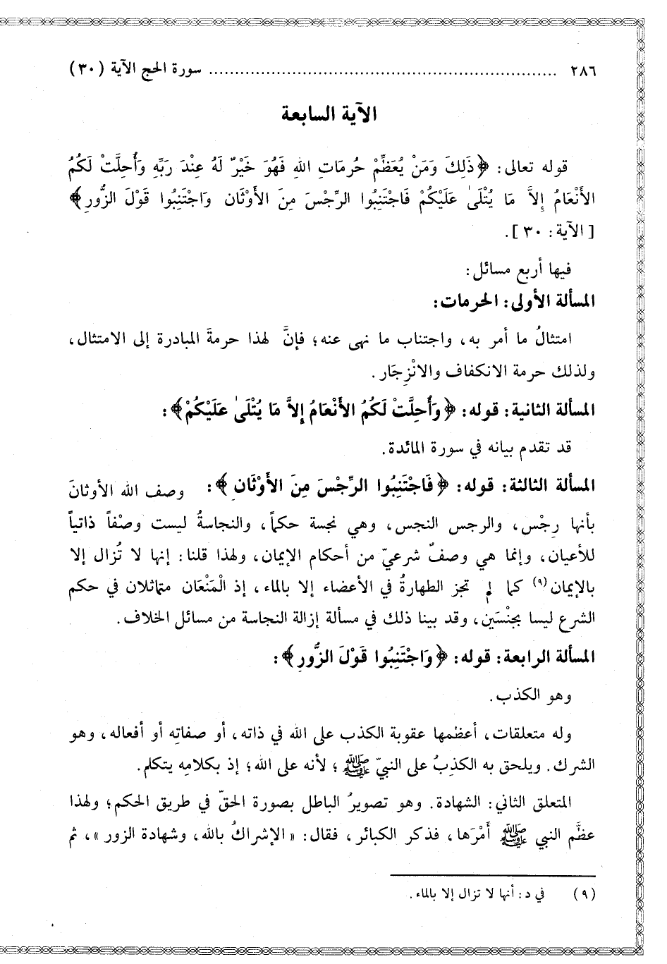 قَوْله تَعَالَى: {ذَلِكَ وَمَنْ يُعَظِّمْ حُرُمَاتِ اللَّهِ فَهُوَ خَيْرٌ لَهُ عِنْدَ رَبِّهِ وَأُحِلَّتْ لَكُمُ الأَنْعَامُ إِلا مَا يُتْلَى عَلَيْكُمْ فَاجْتَنِبُوا الرِّجْسَ مِنَ الأَوْثَانِ وَاجْتَنِبُوا قَوْلَ الزُّورِ} [الحج: 30].