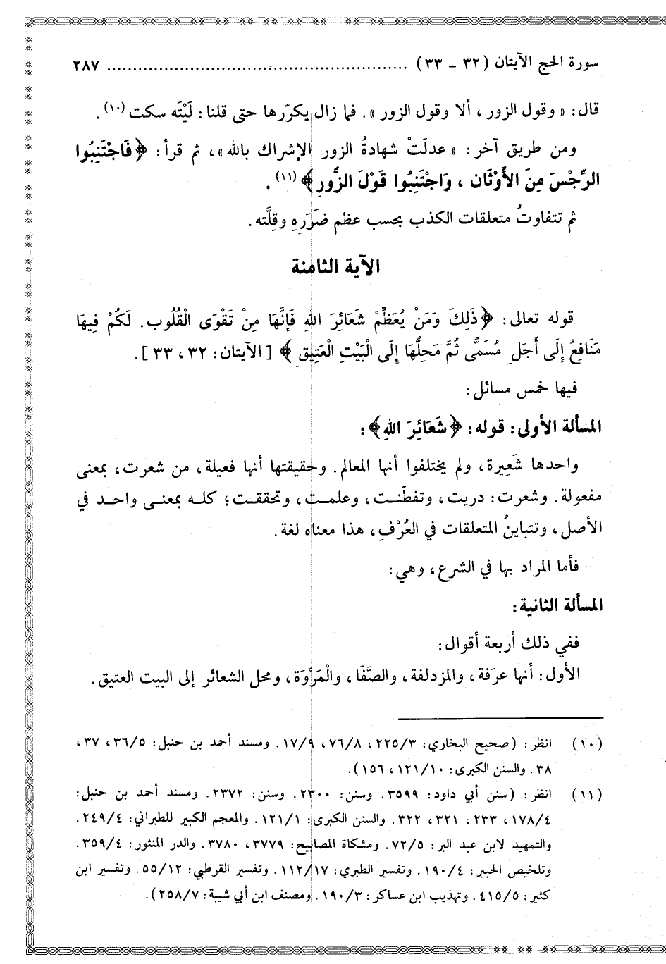 الْمَسْأَلَةُ الْأُولَى: قَوْلُهُ: {شَعَائِرَ اللَّهِ} [الحج: 32]: وَاحِدُهَا شَعِيرَةٌ، وَلَمْ يَخْتَلِفُوا أَنَّهَا الْمَعَالِمُ. وَحَقِيقَتُهَا أَنَّهَا فَعِيلَةٌ، مِنْ شَعَرَتْ، بِمَعْنَى مَفْعُولَةٍ. وَشَعَرْتُ: دَرَيْتُ، وَتَفَطَّنْتُ، وَعَلِمْتُ، وَتَحَقَّقْتُ؛ كُلَّهُ بِمَعْنًى وَاحِدٍ فِي الْأَصْلِ، وَتَتَبَايَنُ الْمُتَعَلِّقَاتُ فِي الْعُرْفِ، هَذَا مَعْنَاهُ لُغَةً. فَأَمَّا الْمُرَادُ بِهَا فِي الشَّرْعِ، وَهِيَ: الْمَسْأَلَةُ الثَّانِيَةُ: فَفِي ذَلِكَ أَرْبَعَةُ أَقْوَالٍ: