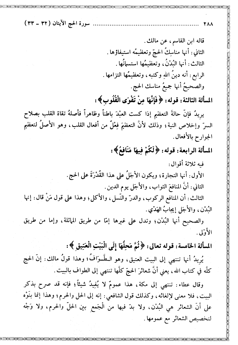 قَالَهُ ابْنُ الْقَاسِمِ عَنْ مَالِكٍ. الثَّانِي: أَنَّهَا مَنَاسِكُ الْحَجِّ وَتَعْظِيمُهُ اسْتِيفَاؤُهَا. الثَّالِثُ: أَنَّهَا الْبُدْنُ، وَتَعْظِيمُهَا اسْتِسْمَانُهَا. الرَّابِعُ: أَنَّهُ دِينُ اللَّهِ وَكُتُبُهُ، وَتَعْظِيمُهَا الْتِزَامُهَا. وَالصَّحِيحُ أَنَّهَا جَمِيعُ مَنَاسِكِ الْحَجِّ.