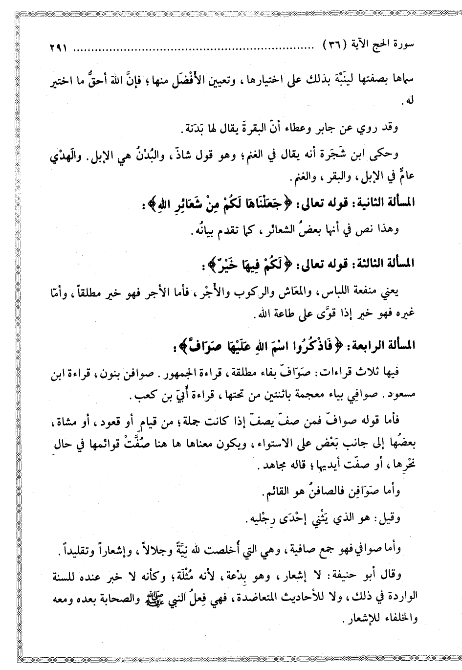 [مَسْأَلَة قِرَاءَة قَوْله تَعَالَى فَاذْكُرُوا اسْمَ اللَّهِ عَلَيْهَا صَوَافَّ]