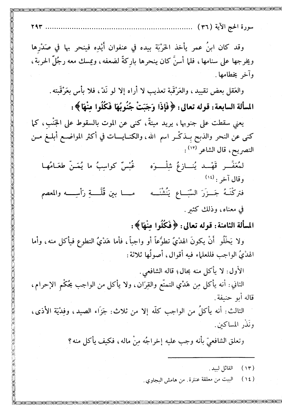 يَعْنِي سَقَطَتْ عَلَى جُنُوبِهَا، يُرِيدُ مَيِّتَةً، كَنَّى عَنْ الْمَوْتِ بِالسُّقُوطِ عَلَى الْجَنْبِ، كَمَا كَنَّى عَنْ النَّحْرِ وَالذَّبْحِ بِذَكَرِ اسْمِ اللَّهِ، وَالْكِنَايَاتُ فِي أَكْثَرِ الْمَوَاضِعِ أَبْلَغُ مِنْ التَّصْرِيحِ قَالَ الشَّاعِرُ: