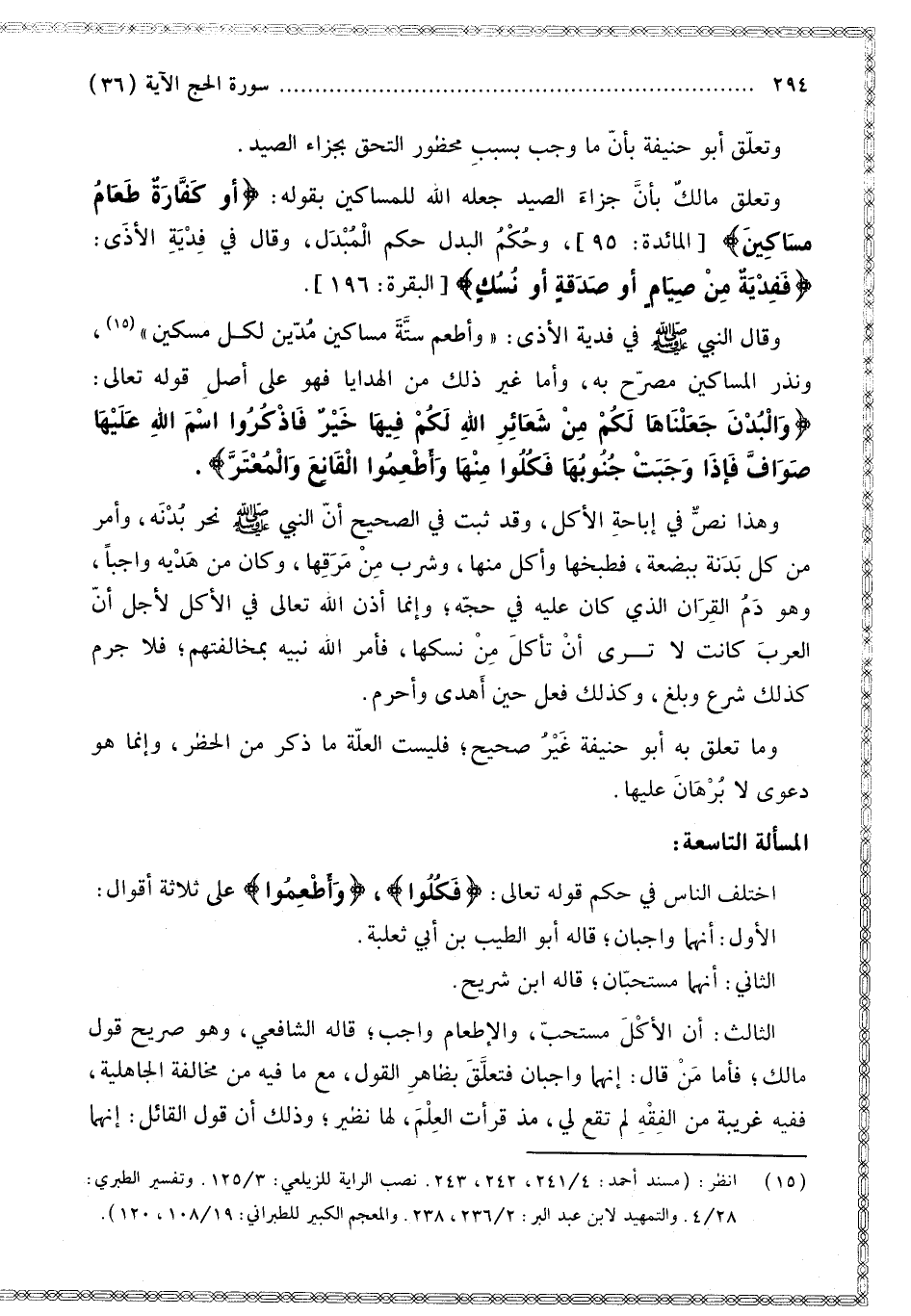 «وَقَالَ النَّبِيُّ - صَلَّى اللَّهُ عَلَيْهِ وَسَلَّمَ - فِي فِدْيَةِ الْأَذَى: وَأَطْعِمْ سِتَّةَ مَسَاكِينَ مُدَّيْنِ لِكُلِّ مِسْكِينٍ»، وَنَذْرُ الْمَسَاكِينِ مُصَرَّحٌ بِهِ، وَأَمَّا غَيْرُ ذَلِكَ مِنْ الْهَدَايَا فَهُوَ عَلَى أَصْلِ قَوْله تَعَالَى: {وَالْبُدْنَ جَعَلْنَاهَا لَكُمْ مِنْ شَعَائِرِ اللَّهِ لَكُمْ فِيهَا خَيْرٌ فَاذْكُرُوا اسْمَ اللَّهِ عَلَيْهَا صَوَافَّ فَإِذَا وَجَبَتْ جُنُوبُهَا فَكُلُوا مِنْهَا وَأَطْعِمُوا الْقَانِعَ وَالْمُعْتَرَّ} [الحج: 36].