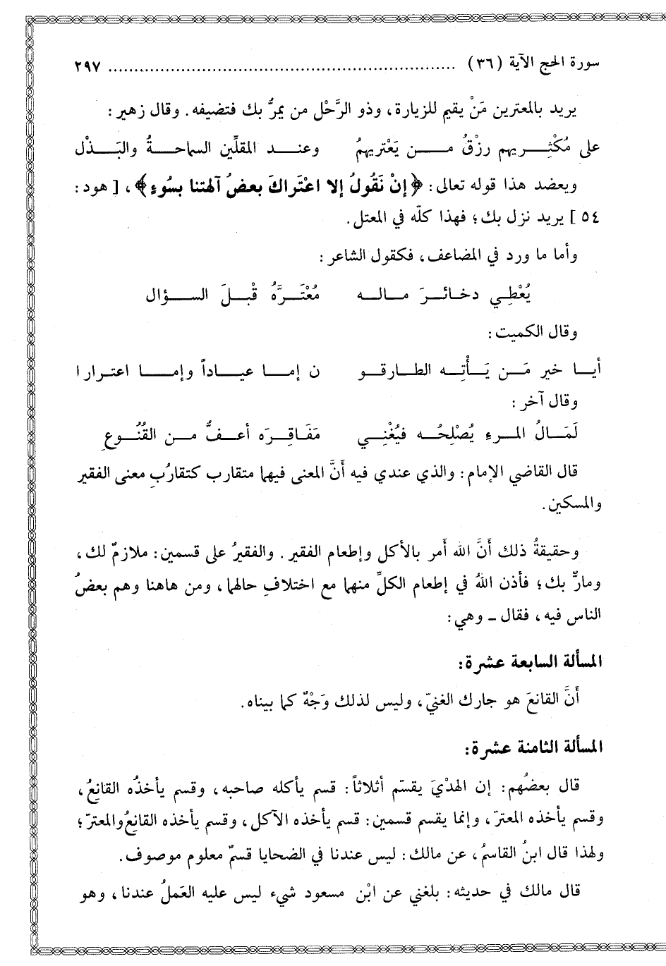 الْمَسْأَلَةُ السَّابِعَةَ عَشْرَةَ: إنَّ الْقَانِعَ هُوَ جَارُك الْغَنِيُّ، وَلَيْسَ لِذَلِكَ وَجْهٌ كَمَا بَيَّنَّاهُ.