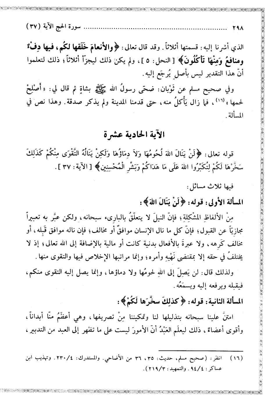 [الْآيَة الْحَادِيَة عَشْرَة قَوْله تَعَالَى لَنْ يَنَالَ اللَّهَ لُحُومُهَا وَلَا دِمَاؤُهَا]