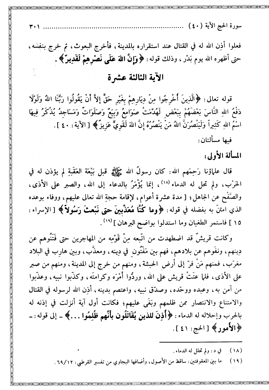 الْمَسْأَلَةُ الْأُولَى: قَالَ عُلَمَاؤُنَا - رَحِمَهُمُ اللَّهُ -: «كَانَ رَسُولُ اللَّهِ - صَلَّى اللَّهُ عَلَيْهِ وَسَلَّمَ - قَبْلَ بَيْعَةِ الْعَقَبَةِ لَمْ يُؤْذَنْ لَهُ فِي الْحَرْبِ، وَلَمْ تَحِلَّ لَهُ الدِّمَاءُ»، إنَّمَا يُؤْمَرُ بِالدُّعَاءِ إلَى اللَّهِ، وَالصَّبْرِ عَلَى الْأَذَى، وَالصَّفْحِ عَنْ الْجَاهِلِ [مُدَّةَ عَشَرَةَ أَعْوَامٍ، لِإِقَامَةِ حُجَّةِ اللَّهِ تَعَالَى عَلَيْهِمْ، وَوَفَاءً بِوَعْدِهِ الَّذِي امْتَنَّ بِهِ بِفَضْلِهِ فِي قَوْلِهِ: {وَمَا كُنَّا مُعَذِّبِينَ حَتَّى نَبْعَثَ رَسُولا} [الإسراء: 15] فَاسْتَمَرَّ الطُّغْيَانُ وَمَا اسْتَدَلُّوا بِوَاضِحِ الْبُرْهَانِ].