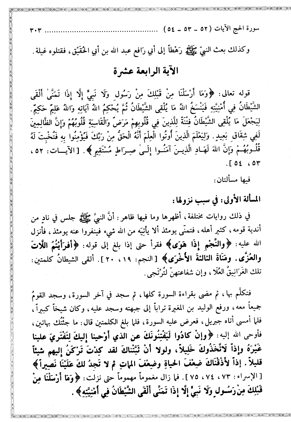أَلْقَى الشَّيْطَانُ فِي أُمْنِيَّتِهِ فَيَنْسَخُ اللَّهُ مَا يُلْقِي الشَّيْطَانُ ثُمَّ يُحْكِمُ اللَّهُ آيَاتِهِ وَاللَّهُ عَلِيمٌ حَكِيمٌ} [الحج: 52] {لِيَجْعَلَ مَا يُلْقِي الشَّيْطَانُ فِتْنَةً لِلَّذِينَ فِي قُلُوبِهِمْ مَرَضٌ وَالْقَاسِيَةِ قُلُوبُهُمْ وَإِنَّ الظَّالِمِينَ لَفِي شِقَاقٍ بَعِيدٍ - وَلِيَعْلَمَ الَّذِينَ أُوتُوا الْعِلْمَ أَنَّهُ الْحَقُّ مِنْ رَبِّكَ فَيُؤْمِنُوا بِهِ فَتُخْبِتَ لَهُ قُلُوبُهُمْ وَإِنَّ اللَّهَ لَهَادِ الَّذِينَ آمَنُوا إِلَى صِرَاطٍ مُسْتَقِيمٍ} [الحج: 53 - 54].