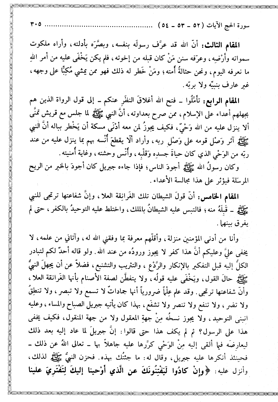 وَأَنَا مِنْ أَدْنَى الْمُؤْمِنِينَ مَنْزِلَةً، وَأَقَلِّهِمْ مَعْرِفَةً بِمَا وَفَّقَنِي اللَّهُ لَهُ، وَآتَانِي مِنْ عِلْمِهِ، لَا يَخْفَى عَلَيَّ وَعَلَيْكُمْ أَنَّ هَذَا كُفْرٌ لَا يَجُوزُ وُرُودُهُ مِنْ عِنْدِ اللَّهِ. وَلَوْ قَالَهُ أَحَدٌ لَكُمْ لَتَبَادَرَ الْكُلُّ إلَيْهِ قَبْلَ التَّفْكِيرِ بِالْإِنْكَارِ وَالرَّدْعِ، وَالتَّثْرِيبِ وَالتَّشْنِيعِ، فَضْلًا عَنْ أَنْ يَجْهَلَ النَّبِيُّ - صَلَّى اللَّهُ عَلَيْهِ وَسَلَّمَ - حَالَ الْقَوْلِ، وَيَخْفَى عَلَيْهِ قَوْلُهُ، وَلَا يَتَفَطَّنُ لِصِفَةِ الْأَصْنَامِ بِأَنَّهَا الْغَرَانِقَةُ الْعُلَا، وَأَنَّ شَفَاعَتَهَا تُرْتَجَى.