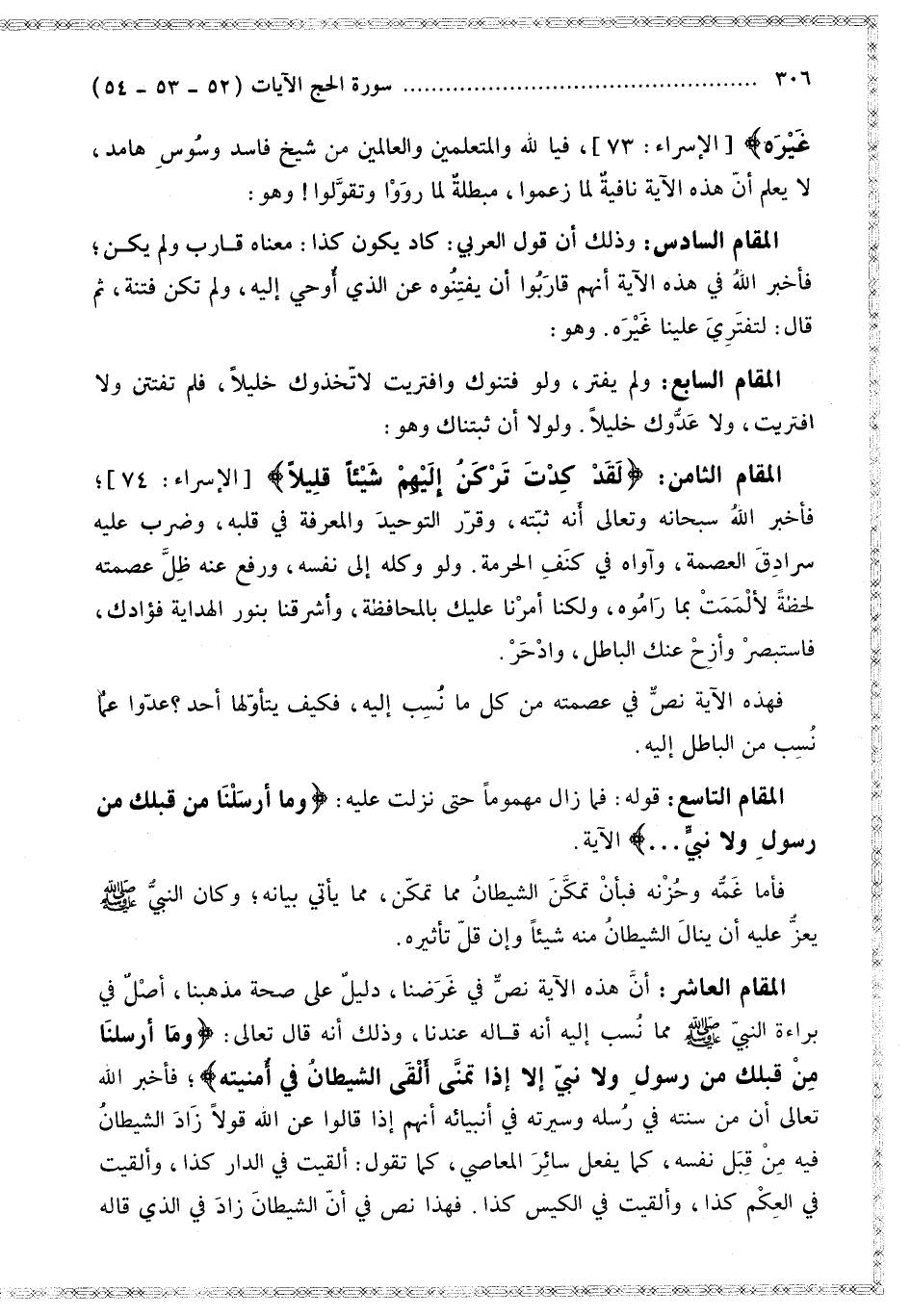أَنَّ هَذِهِ الْآيَةَ نَصٌّ فِي غَرَضِنَا، دَلِيلٌ عَلَى صِحَّةِ مَذْهَبِنَا، أَصْلٌ فِي بَرَاءَةِ النَّبِيِّ - صَلَّى اللَّهُ عَلَيْهِ وَسَلَّمَ - مِمَّا نُسِبَ إلَيْهِ أَنَّهُ قَالَهُ عِنْدَنَا، وَذَلِكَ أَنَّهُ قَالَ تَعَالَى: {وَمَا أَرْسَلْنَا مِنْ قَبْلِكَ مِنْ رَسُولٍ وَلا نَبِيٍّ إِلا إِذَا تَمَنَّى أَلْقَى الشَّيْطَانُ فِي أُمْنِيَّتِهِ} [الحج: 52] فَأَخْبَرَ اللَّهُ تَعَالَى أَنَّ مِنْ سُنَّتِهِ فِي رُسُلِهِ وَسِيرَتِهِ فِي أَنْبِيَائِهِ أَنَّهُمْ إذَا قَالُوا عَنْ اللَّهِ قَوْلًا زَادَ الشَّيْطَانُ فِيهِ مِنْ قِبَلِ نَفْسِهِ، كَمَا يَفْعَلُ سَائِرُ الْمَعَاصِي، كَمَا تَقُولُ: أَلْقَيْت فِي الدَّارِ كَذَا، وَأَلْقَيْت فِي الْعِكْمِ كَذَا، وَأَلْقَيْت فِي الْكِيسِ كَذَا.
