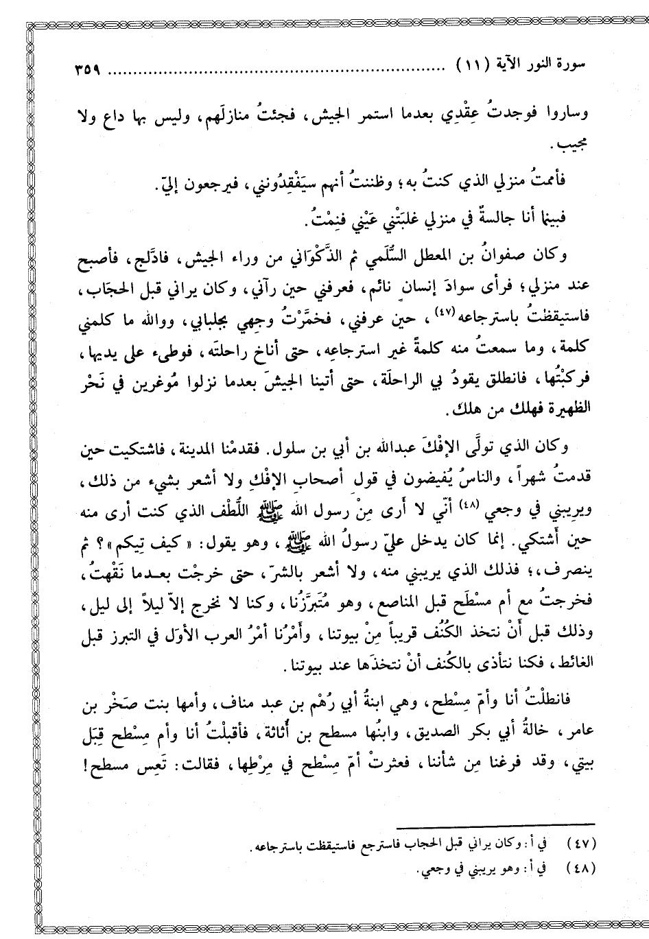 وَسَارُوا فَوَجَدْت عِقْدِي بَعْدَمَا اسْتَمَرَّ الْجَيْشُ، فَجِئْت مَنَازِلَهُمْ، وَلَيْسَ بِهَا دَاعٍ وَلَا مُجِيبٌ. فَأَمَمْت مَنْزِلِي الَّذِي كُنْت بِهِ، وَظَنَنْت أَنَّهُمْ سَيَفْقِدُونَنِي، فَيَرْجِعُونَ إلَيَّ. فَبَيْنَمَا أَنَا جَالِسَةٌ فِي مَنْزِلِي غَلَبَتْنِي عَيْنِي فَنِمْت. وَكَانَ صَفْوَانُ بْنُ الْمُعَطِّلِ السُّلَمِيُّ ثُمَّ الذَّكْوَانِيُّ مِنْ وَرَاءِ الْجَيْشِ، فَادَّلَجَ، فَأَصْبَحَ عِنْدَ مَنْزِلِي؛ فَرَأَى سَوَادَ إنْسَانٍ نَائِمٍ، فَعَرَفَنِي حِينَ رَآنِي، وَكَانَ يَرَانِي قَبْلَ الْحِجَابِ، فَاسْتَيْقَظْت بِاسْتِرْجَاعِهِ، حِينَ عَرَفَنِي، فَخَمَّرْت وَجْهِي بِجِلْبَابِي، وَوَاللَّهِ مَا كَلَّمَنِي كَلِمَةً، وَمَا سَمِعْت مِنْهُ كَلِمَةً غَيْرَ اسْتِرْجَاعِهِ، حَتَّى أَنَاخَ رَاحِلَتَهُ، فَوَطِئَ عَلَى يَدَيْهَا، فَرَكِبْتهَا، فَانْطَلَقَ يَقُودُ بِي الرَّاحِلَةَ، حَتَّى أَتَيْنَا الْجَيْشَ بَعْدَمَا نَزَلُوا مُوغِرِينَ فِي نَحْرِ الظَّهِيرَةِ فَهَلَكَ مَنْ هَلَكَ. وَكَانَ الَّذِي تَوَلَّى الْإِفْكَ عَبْدُ اللَّهِ بْنُ أُبَيٍّ ابْنُ سَلُولَ. فَقَدِمْنَا الْمَدِينَةَ، فَاشْتَكَيْت حِينَ قَدِمْت شَهْرًا، وَالنَّاسُ يُفِيضُونَ فِي قَوْلِ أَصْحَابِ الْإِفْكِ وَلَا أَشْعُرُ بِشَيْءٍ مِنْ ذَلِكَ، وَيَرِيبُنِي فِي وَجَعِي أَنِّي لَا أَرَى مِنْ رَسُولِ اللَّهِ - صَلَّى اللَّهُ عَلَيْهِ وَسَلَّمَ - اللُّطْفَ الَّذِي كُنْت أَرَى مِنْهُ حِينَ أَشْتَكِي. إنَّمَا كَانَ يَدْخُلُ عَلَيَّ رَسُولُ اللَّهِ - صَلَّى اللَّهُ عَلَيْهِ وَسَلَّمَ - وَهُوَ يَقُولُ: كَيْفَ تِيكُمْ؟ ثُمَّ يَنْصَرِفُ، فَذَلِكَ الَّذِي يَرِيبُنِي مِنْهُ، وَلَا أَشْعُرُ بِالشَّرِّ، حَتَّى خَرَجْت بَعْدَمَا نَقِهْتُ، فَخَرَجْت مَعَ أُمِّ مِسْطَحٍ قِبَلَ الْمَنَاصِعِ، وَهُوَ مُتَبَرَّزُنَا، وَكُنَّا لَا نَخْرُجُ إلَّا لَيْلًا إلَى لَيْلٍ، وَذَلِكَ قَبْلَ أَنْ نَتَّخِذَ الْكُنُفَ قَرِيبًا مِنْ بُيُوتِنَا، وَأَمْرُنَا أَمْرُ الْعَرَبِ الْأُوَلِ فِي التَّبَرُّزِ قِبَلَ الْغَائِطِ، فَكُنَّا نَتَأَذَّى بِالْكُنُفِ أَنْ نَتَّخِذَهَا عِنْدَ بُيُوتِنَا. فَانْطَلَقْت أَنَا وَأُمُّ مِسْطَحٍ، وَهِيَ ابْنَةُ أَبِي رُهْمِ بْنِ عَبْدِ مَنَافٍ، وَأُمُّهَا بِنْتُ صَخْرِ بْنِ عَامِرٍ، خَالَةُ أَبِي بَكْرٍ الصِّدِّيقِ، وَابْنُهَا مِسْطَحُ بْنُ أُثَاثَةَ، فَأَقْبَلْت أَنَا وَأُمُّ مِسْطَحٍ قِبَلَ بَيْتِي، وَقَدْ فَرَغْنَا مِنْ شَأْنِنَا، فَعَثَرَتْ أُمُّ مِسْطَحٍ فِي مِرْطِهَا، فَقَالَتْ: تَعِسَ مِسْطَحٌ،