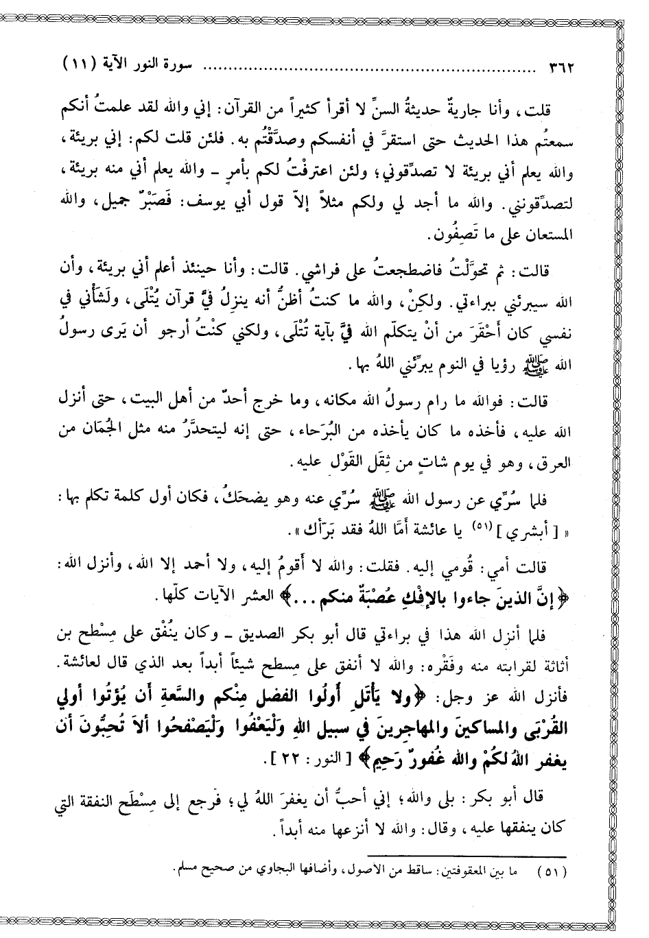 قُلْت، وَأَنَا جَارِيَةٌ حَدِيثَةُ السِّنِّ لَا أَقْرَأُ كَثِيرًا مِنْ الْقُرْآنِ: إنِّي وَاَللَّهِ لَقَدْ عَلِمْت أَنَّكُمْ سَمِعْتُمْ هَذَا الْحَدِيثَ حَتَّى اسْتَقَرَّ فِي أَنْفُسِكُمْ وَصَدَّقْتُمْ بِهِ. فَلَئِنْ قُلْت لَكُمْ: إنِّي بَرِيئَةٌ، وَاَللَّهُ يَعْلَمُ أَنِّي بَرِيئَةٌ لَا تُصَدِّقُونِي؛ وَلَئِنْ اعْتَرَفْت لَكُمْ بِأَمْرٍ وَاَللَّهُ يَعْلَمُ أَنِّي مِنْهُ بَرِيئَةٌ، لَتُصَدِّقُونَنِي. وَاَللَّهِ مَا أَجِدُ لِي وَلَكُمْ مَثَلًا إلَّا قَوْلَ أَبِي يُوسُفَ: {فَصَبْرٌ جَمِيلٌ وَاللَّهُ الْمُسْتَعَانُ عَلَى مَا تَصِفُونَ} [يوسف: 18]. قَالَتْ: ثُمَّ تَحَوَّلْتُ فَاضْطَجَعْت عَلَى فِرَاشِي. قَالَتْ: وَأَنَا حِينَئِذٍ أَعْلَمُ أَنِّي بَرِيئَةٌ، وَأَنَّ اللَّهَ سَيُبَرِّئُنِي بِبَرَاءَتِي. وَلَكِنْ، وَاَللَّهِ مَا كُنْت أَظُنُّ أَنَّهُ يَنْزِلُ فِي قُرْآنٌ يُتْلَى، وَلَشَأْنِي فِي نَفْسِي كَانَ أَحْقَرَ مِنْ أَنْ يَتَكَلَّمَ اللَّهُ فِي بِآيَةٍ تُتْلَى، وَلَكِنِّي كُنْت أَرْجُو أَنْ يَرَى رَسُولُ اللَّهِ - صَلَّى اللَّهُ عَلَيْهِ وَسَلَّمَ - رُؤْيَا فِي النَّوْمِ يُبَرِّئُنِي اللَّهُ بِهَا. قَالَتْ: فَوَاَللَّهِ مَا رَامَ رَسُولُ اللَّهِ مَكَانَهُ، وَمَا خَرَجَ أَحَدٌ مِنْ أَهْلِ الْبَيْتِ، حَتَّى أَنْزَلَ اللَّهُ عَلَيْهِ، فَأَخَذَهُ مَا كَانَ يَأْخُذُهُ مِنْ الْبُرَحَاءِ، حَتَّى إنَّهُ لِيَتَحَدَّرَ مِنْهُ مِثْلُ الْجُمَانِ مِنْ الْعَرَقِ، وَهُوَ فِي يَوْمٍ شَاتٍ مِنْ ثِقَلِ الْقَوْلِ عَلَيْهِ. فَلَمَّا سُرِّيَ عَنْ رَسُولِ اللَّهِ - صَلَّى اللَّهُ عَلَيْهِ وَسَلَّمَ - سُرِّيَ عَنْهُ وَهُوَ يَضْحَكُ، فَكَانَ أَوَّلُ كَلِمَةٍ تَكَلَّمَ بِهَا: أَبْشِرِي يَا عَائِشَةُ أَمَّا اللَّهُ فَقَدْ بَرَّأَكِ. قَالَتْ أُمِّي: قُومِي إلَيْهِ. فَقُلْت: وَاَللَّهِ لَا أَقُومُ إلَيْهِ، وَلَا أَحْمَدُ إلَّا اللَّهَ، وَأَنْزَلَ اللَّهُ: {إِنَّ الَّذِينَ جَاءُوا بِالإِفْكِ عُصْبَةٌ مِنْكُمْ} [النور: 11] الْعَشْرَ الْآيَاتِ كُلِّهَا. فَلَمَّا أَنْزَلَ اللَّهُ هَذَا فِي بَرَاءَتِي قَالَ أَبُو بَكْرٍ الصِّدِّيقُ وَكَانَ يُنْفِقُ عَلَى مِسْطَحِ بْنِ أُثَاثَةَ لِقَرَابَتِهِ مِنْهُ وَفَقْرِهِ: وَاَللَّهِ لَا أُنْفِقُ عَلَى مِسْطَحٍ شَيْئًا أَبَدًا بَعْدَ الَّذِي قَالَ لِعَائِشَةَ. فَأَنْزَلَ اللَّهُ عَزَّ وَجَلَّ: {وَلا يَأْتَلِ أُولُو الْفَضْلِ مِنْكُمْ وَالسَّعَةِ أَنْ يُؤْتُوا أُولِي الْقُرْبَى وَالْمَسَاكِينَ وَالْمُهَاجِرِينَ فِي سَبِيلِ اللَّهِ وَلْيَعْفُوا وَلْيَصْفَحُوا أَلا تُحِبُّونَ أَنْ يَغْفِرَ اللَّهُ لَكُمْ وَاللَّهُ غَفُورٌ رَحِيمٌ} [النور: 22]. قَالَ أَبُو بَكْرٍ: بَلَى وَاَللَّهِ؛ إنِّي أُحِبُّ أَنْ يَغْفِرَ اللَّهُ لِي؛ فَرَجَعَ إلَى مِسْطَحٍ النَّفَقَةَ الَّتِي كَانَ يُنْفِقُهَا عَلَيْهِ، وَقَالَ: وَاَللَّهِ لَا أَنْزِعُهَا مِنْهُ أَبَدًا.