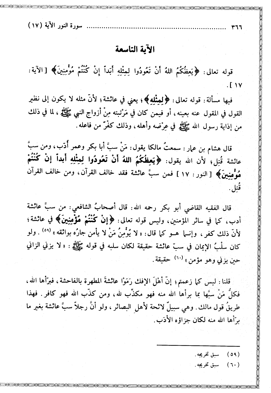 قَالَ الْفَقِيهُ الْقَاضِي أَبُو بَكْرٍ - رَحِمَهُ اللَّهُ -: قَالَ أَصْحَابُ الشَّافِعِيِّ: مَنْ سَبَّ عَائِشَةَ أُدِّبَ، كَمَا فِي سَائِرِ الْمُؤْمِنِينَ، وَلَيْسَ قَوْله تَعَالَى: {إِنْ كُنْتُمْ مُؤْمِنِينَ} [النور: 17] فِي عَائِشَةَ؛ لِأَنَّ ذَلِكَ كُفْرٌ، وَإِنَّمَا هُوَ كَمَا قَالَ: «لَا يُؤْمِنُ مَنْ لَا يَأْمَنُ جَارُهُ بَوَائِقَهُ». وَلَوْ كَانَ سَلْبُ الْإِيمَانِ فِي سَبِّ عَائِشَةَ حَقِيقَةً لَكَانَ سَلْبُهُ فِي قَوْلِهِ - صَلَّى اللَّهُ عَلَيْهِ وَسَلَّمَ - «لَا يَزْنِي الزَّانِي حِينَ يَزْنِي وَهُوَ مُؤْمِنٌ» حَقِيقَةً.