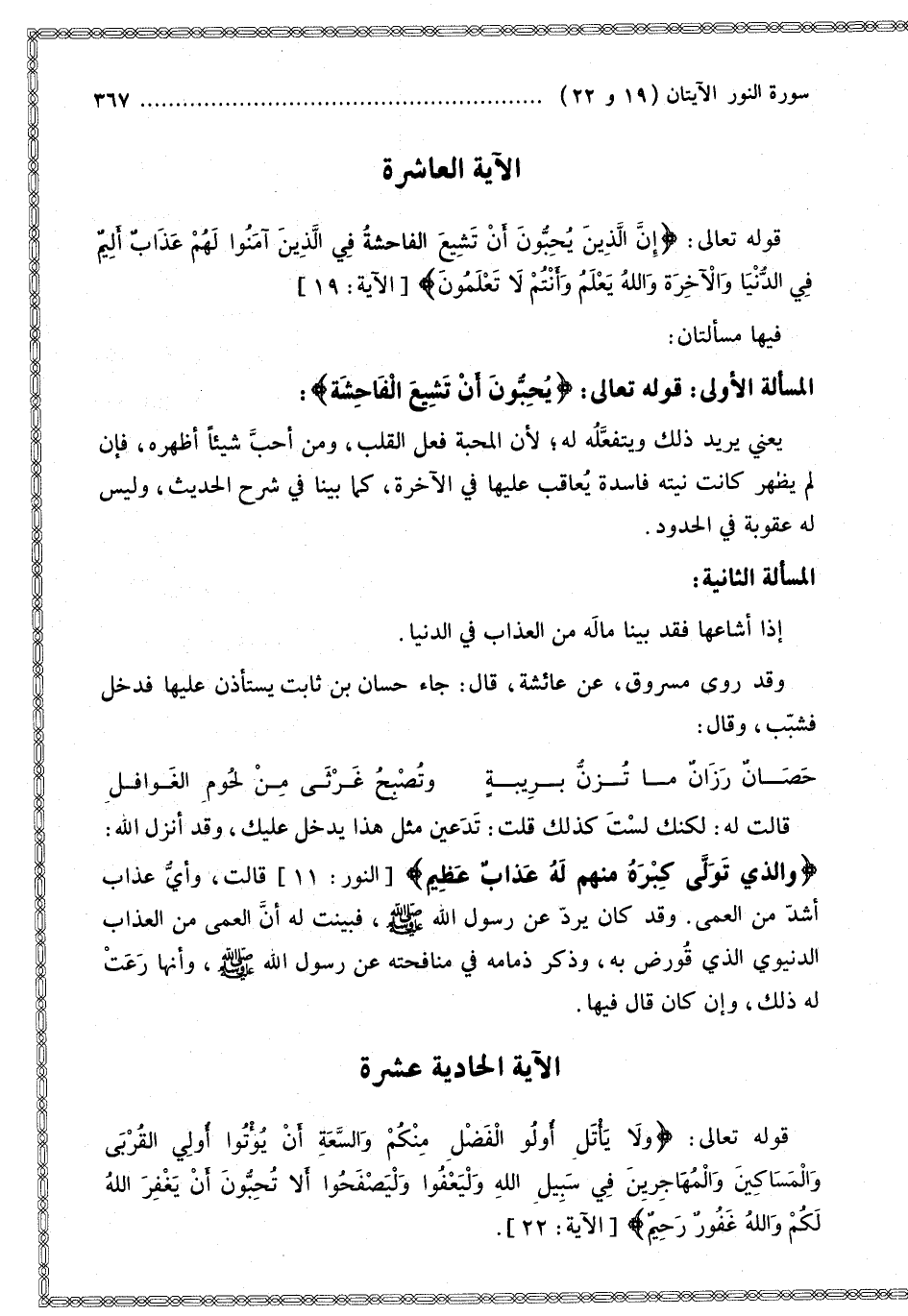 فِيهَا مَسْأَلَتَانِ: الْمَسْأَلَةُ الْأُولَى: قَوْله تَعَالَى: {يُحِبُّونَ أَنْ تَشِيعَ الْفَاحِشَةُ} [النور: 19]