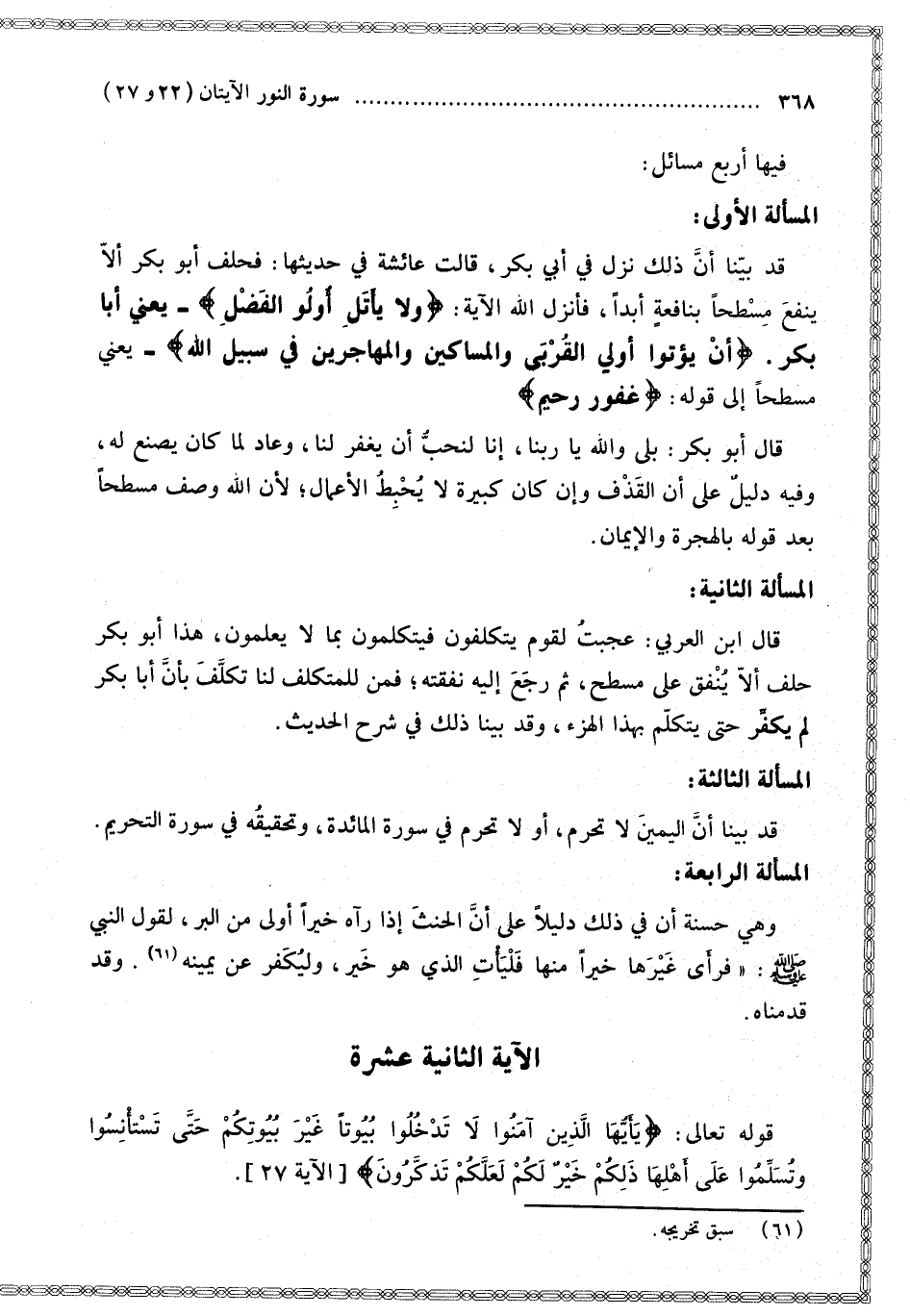 فِيهَا أَرْبَعُ مَسَائِلَ: الْمَسْأَلَةُ الْأُولَى: قَدْ بَيَّنَّا أَنَّ ذَلِكَ نَزَلَ فِي أَبِي بَكْرٍ قَالَتْ عَائِشَةُ فِي حَدِيثِهَا: فَحَلَفَ أَبُو بَكْرٍ أَلَّا يَنْفَعَ مِسْطَحًا بِنَافِعَةٍ أَبَدًا، فَأَنْزَلَ اللَّهُ الْآيَةَ: {وَلا يَأْتَلِ أُولُو الْفَضْلِ} [النور: 22] يَعْنِي أَبَا بَكْرٍ. {أَنْ يُؤْتُوا أُولِي الْقُرْبَى وَالْمَسَاكِينَ وَالْمُهَاجِرِينَ فِي سَبِيلِ اللَّهِ} [النور: 22] يَعْنِي مِسْطَحًا إلَى قَوْلِهِ: {غَفُورٌ رَحِيمٌ} [النور: 22] قَالَ أَبُو بَكْرٍ: بَلَى وَاَللَّهِ يَا رَبَّنَا، إنَّا لَنُحِبُّ أَنْ يُغْفَرَ لَنَا، وَعَادَ لِمَا كَانَ يَصْنَعُ لَهُ، وَفِيهِ دَلِيلٌ عَلَى أَنَّ الْقَذْفَ وَإِنْ كَانَ كَبِيرَةً لَا يُحْبِطُ الْأَعْمَالَ؛ لِأَنَّ اللَّهَ وَصَفَ مِسْطَحًا بَعْدَ قَوْلِهِ بِالْهِجْرَةِ وَالْإِيمَانِ.