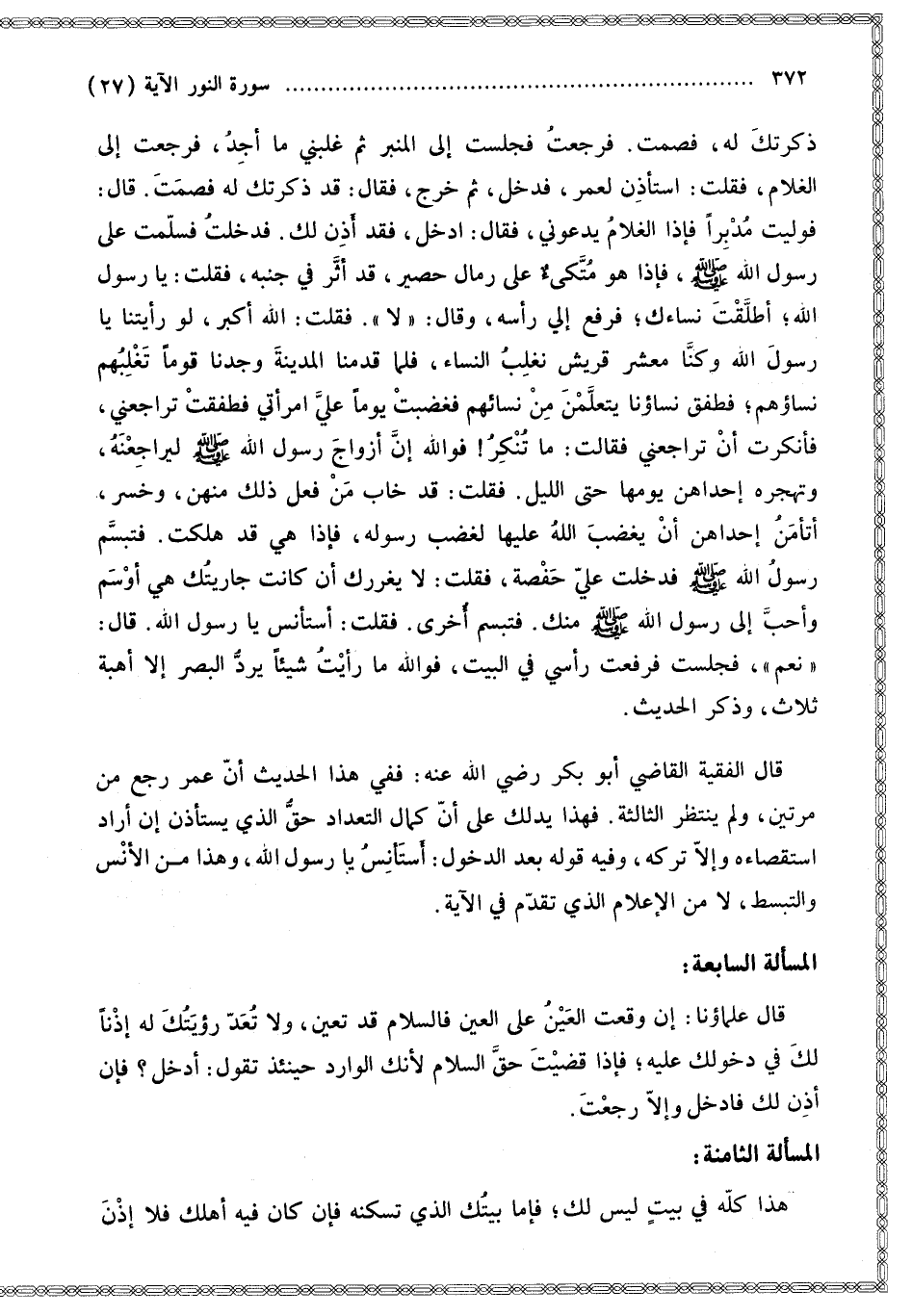 قَالَ الْفَقِيهُ الْقَاضِي أَبُو بَكْرٍ - رَضِيَ اللَّهُ عَنْهُ -: فَفِي هَذَا الْحَدِيثِ أَنَّ عُمَرَ رَجَعَ مِنْ مَرَّتَيْنِ، وَلَمْ يَنْتَظِرْ الثَّالِثَةَ. فَهَذَا يَدُلُّك عَلَى أَنَّ كَمَالَ التَّعْدَادِ حَقُّ الَّذِي يَسْتَأْذِنُ إنْ أَرَادَ اسْتِقْصَاءَهُ وَإِلَّا تَرَكَهُ، وَفِيهِ قَوْلُهُ بَعْدَ الدُّخُولِ: أَسْتَأْنِسُ يَا رَسُولَ اللَّهِ، وَهَذَا مِنْ الْأُنْسِ وَالتَّبَسُّطِ، لَا مِنْ الْإِعْلَامِ الَّذِي تَقَدَّمَ فِي الْآيَةِ.