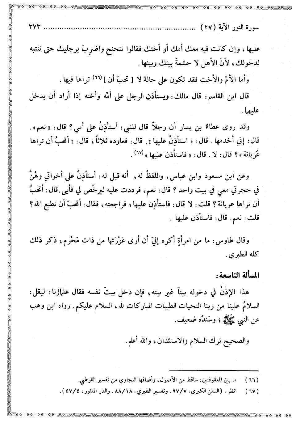 هَذَا الْإِذْنُ فِي دُخُولِهِ بَيْتًا غَيْرَ بَيْتِهِ، فَإِنْ دَخَلَ بَيْتَ نَفْسِهِ فَقَالَ عُلَمَاؤُنَا: لِيَقُلْ: السَّلَامُ عَلَيْنَا مِنْ رَبِّنَا التَّحِيَّاتُ الطَّيِّبَاتُ الْمُبَارَكَاتُ لِلَّهِ، السَّلَامُ عَلَيْكُمْ. رَوَاهُ ابْنُ وَهْبٍ عَنْ النَّبِيِّ - صَلَّى اللَّهُ عَلَيْهِ وَسَلَّمَ -؛ وَسَنَدُهُ ضَعِيفٌ.