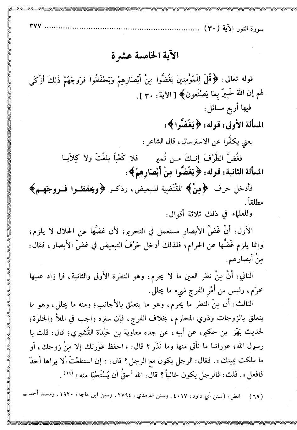 ْ ذَلِكَ أَزْكَى لَهُمْ إِنَّ اللَّهَ خَبِيرٌ بِمَا يَصْنَعُونَ} [النور: 30]. فِيهَا أَرْبَعُ مَسَائِلَ:
