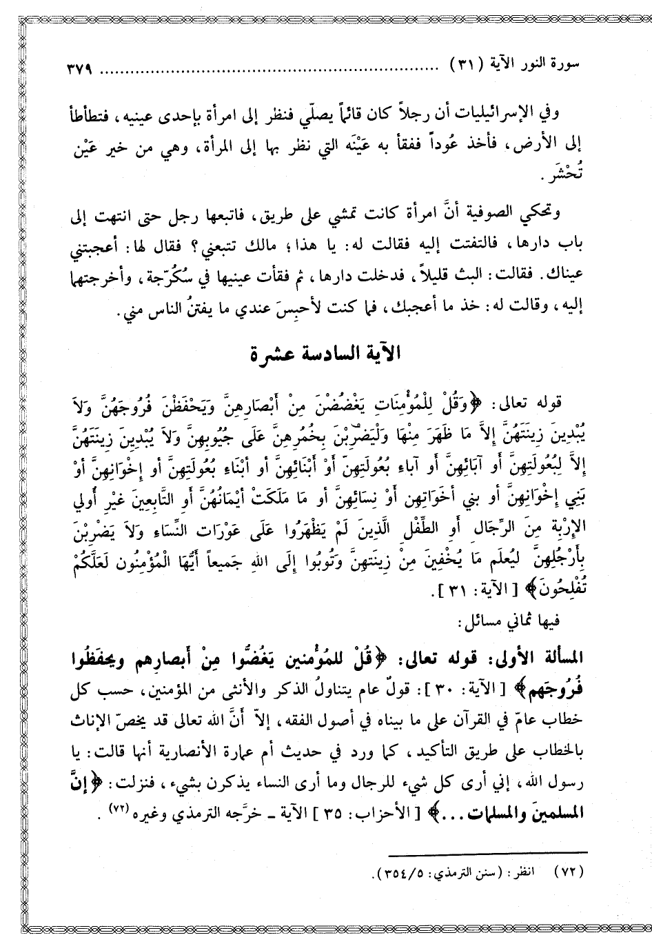 َّ وَلا يُبْدِينَ زِينَتَهُنَّ إِلا مَا ظَهَرَ مِنْهَا وَلْيَضْرِبْنَ بِخُمُرِهِنَّ عَلَى جُيُوبِهِنَّ وَلا يُبْدِينَ زِينَتَهُنَّ إِلا لِبُعُولَتِهِنَّ أَوْ آبَائِهِنَّ أَوْ آبَاءِ بُعُولَتِهِنَّ أَوْ أَبْنَائِهِنَّ أَوْ أَبْنَاءِ بُعُولَتِهِنَّ أَوْ إِخْوَانِهِنَّ أَوْ بَنِي إِخْوَانِهِنَّ أَوْ بَنِي أَخَوَاتِهِنَّ أَوْ نِسَائِهِنَّ أَوْ مَا مَلَكَتْ أَيْمَانُهُنَّ أَوِ التَّابِعِينَ غَيْرِ أُولِي الإِرْبَةِ مِنَ الرِّجَالِ أَوِ الطِّفْلِ الَّذِينَ لَمْ يَظْهَرُوا عَلَى عَوْرَاتِ النِّسَاءِ وَلا يَضْرِبْنَ بِأَرْجُلِهِنَّ لِيُعْلَمَ مَا يُخْفِينَ مِنْ زِينَتِهِنَّ وَتُوبُوا إِلَى اللَّهِ جَمِيعًا أَيُّهَ الْمُؤْمِنُونَ لَعَلَّكُمْ تُفْلِحُونَ} [النور: 31].
