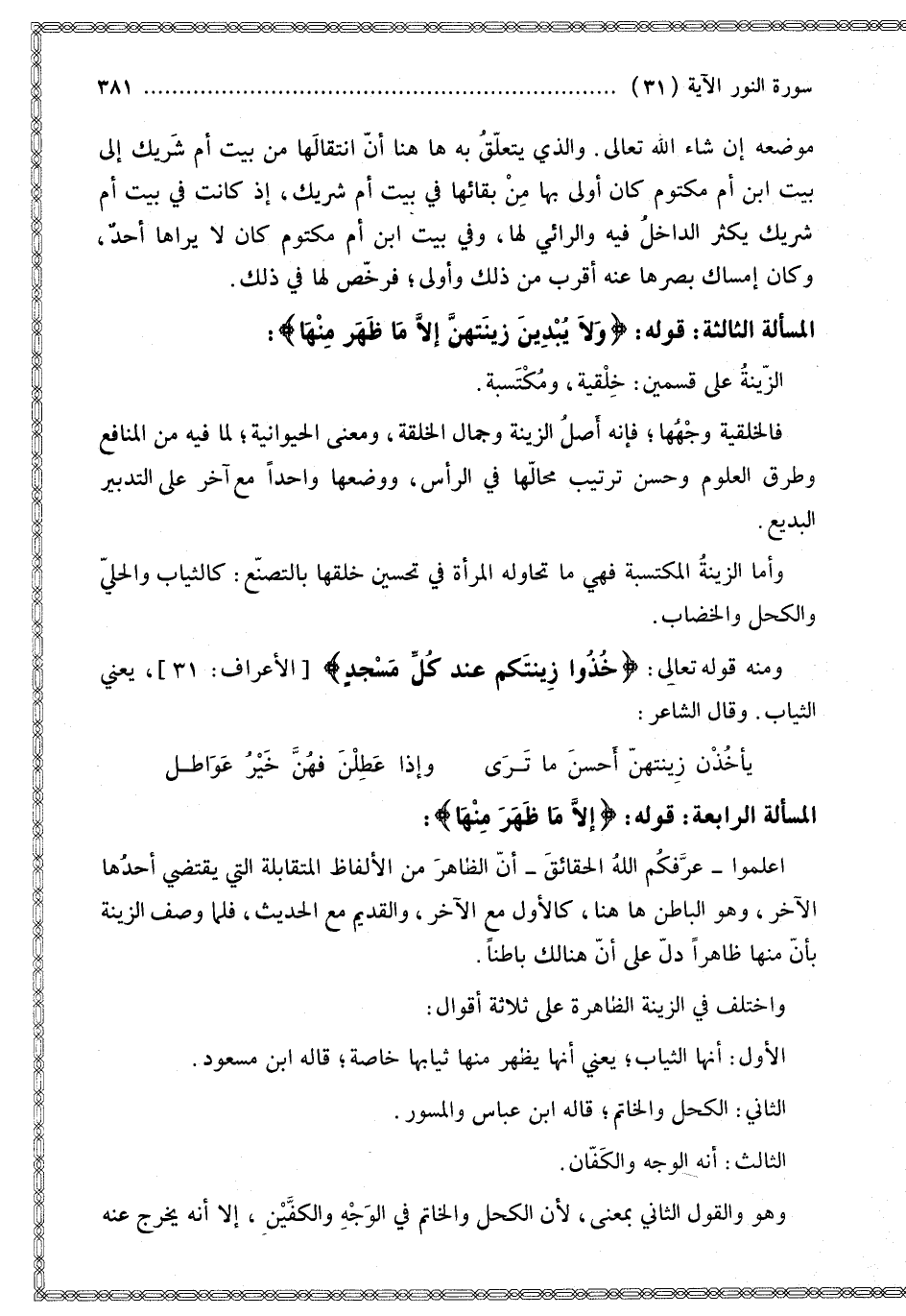 الْمَسْأَلَةُ الثَّالِثَةُ: قَوْلُهُ: {وَلا يُبْدِينَ زِينَتَهُنَّ إِلا مَا ظَهَرَ مِنْهَا} [النور: 31]: الزِّينَةُ عَلَى قِسْمَيْنِ: خِلْقِيَّةٌ، وَمُكْتَسَبَةٌ. فَالْخِلْقِيَّةُ وَجْهُهَا فَإِنَّهُ أَصْلُ الزِّينَةِ وَجَمَالُ الْخِلْقَةِ، وَمَعْنَى الْحَيَوَانِيَّةِ؛ لِمَا فِيهِ مِنْ الْمَنَافِعِ وَطُرُقِ الْعُلُومِ وَحُسْنِ تَرْتِيبِ مَحَالِّهَا فِي الرَّأْسِ، وَوَضْعِهَا وَاحِدًا مَعَ آخَرَ عَلَى التَّدْبِيرِ الْبَدِيعِ. وَأَمَّا الزِّينَةُ الْمُكْتَسَبَةُ فَهِيَ مَا تُحَاوِلُهُ الْمَرْأَةُ فِي تَحْسِينِ خَلْقِهَا بِالتَّصَنُّعِ: كَالثِّيَابِ وَالْحُلِيِّ وَالْكُحْلِ وَالْخِضَابِ. وَمِنْهُ قَوْله تَعَالَى: {خُذُوا زِينَتَكُمْ عِنْدَ كُلِّ مَسْجِدٍ} [الأعراف: 31] يَعْنِي الثِّيَابَ. وَقَالَ الشَّاعِرُ: