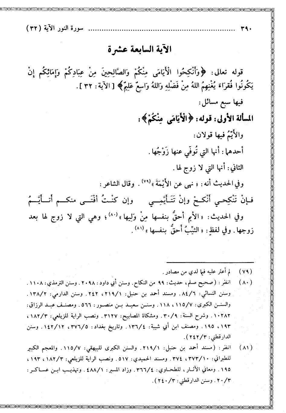َ مِنْ عِبَادِكُمْ وَإِمَائِكُمْ إِنْ يَكُونُوا فُقَرَاءَ يُغْنِهِمُ اللَّهُ مِنْ فَضْلِهِ وَاللَّهُ وَاسِعٌ عَلِيمٌ} [النور: 32]. فِيهَا سَبْعُ مَسَائِلَ: الْمَسْأَلَةُ الْأُولَى: قَوْلُهُ: {الأَيَامَى مِنْكُمْ} [النور: 32] وَالْأَيِّمُ فِيهَا قَوْلَانِ: أَحَدُهُمَا: أَنَّهَا الَّتِي تُوُفِّيَ عَنْهَا زَوْجُهَا. الثَّانِي: أَنَّهَا الَّتِي لَا زَوْجَ لَهَا.