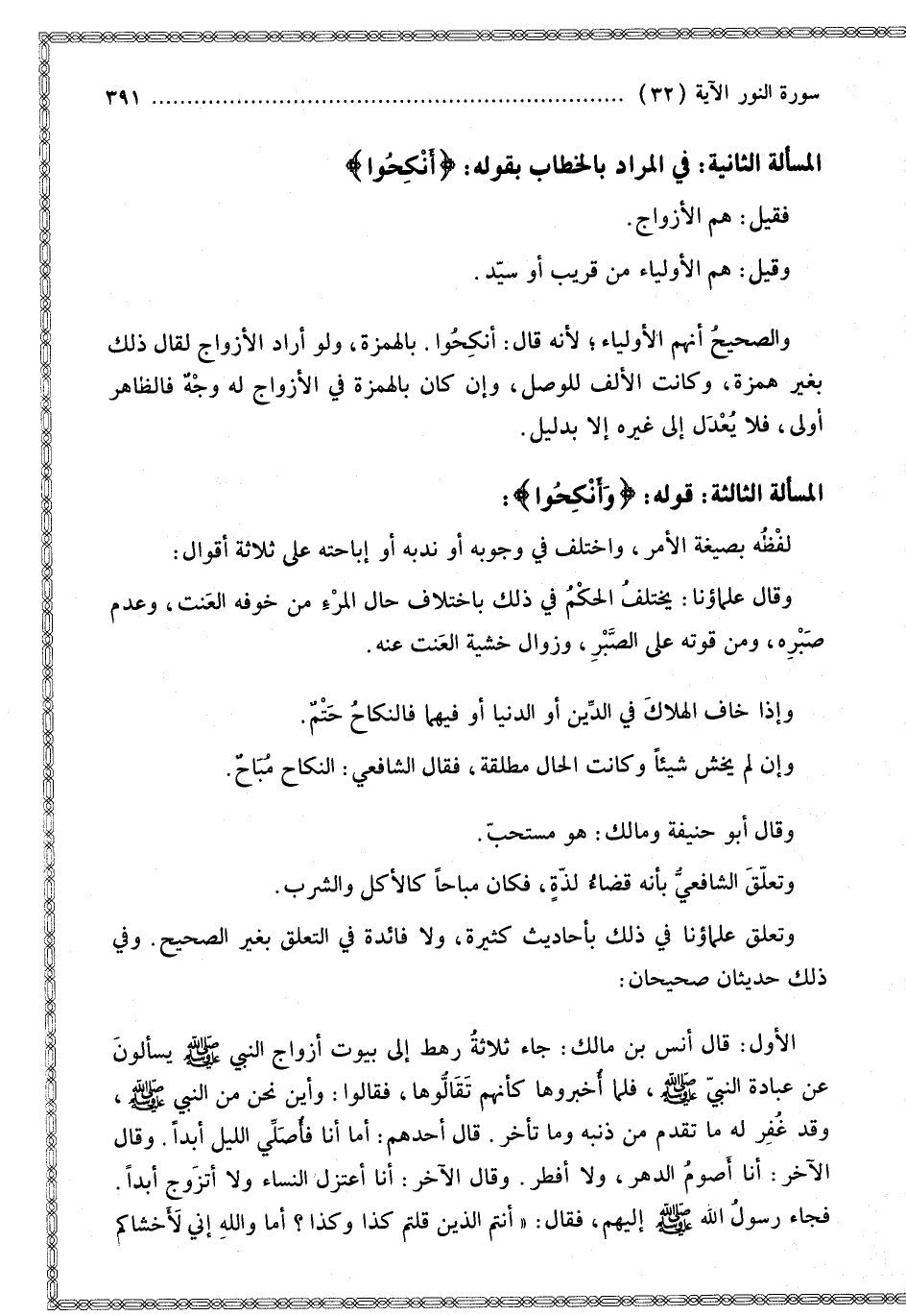 الْمَسْأَلَةُ الثَّانِيَةُ: فِي الْمُرَادِ بِالْخِطَابِ بِقَوْلِهِ: {وَأَنْكِحُوا} [النور: 32] فَقِيلَ: هُمْ الْأَزْوَاجُ. وَقِيلَ: هُمْ الْأَوْلِيَاءُ مِنْ قَرِيبٍ أَوْ سَيِّدٍ. وَالصَّحِيحُ أَنَّهُمْ الْأَوْلِيَاءُ؛ لِأَنَّهُ قَالَ: أَنْكِحُوا. بِالْهَمْزَةِ، وَلَوْ أَرَادَ الْأَزْوَاجَ لَقَالَ ذَلِكَ بِغَيْرِ هَمْزَةٍ، وَكَانَتْ الْأَلِفُ لِلْوَصْلِ، وَإِنْ كَانَ بِالْهَمْزَةِ فِي الْأَزْوَاجِ لَهُ وَجْهٌ فَالظَّاهِرُ أَوْلَى، فَلَا يُعْدَلُ إلَى غَيْرِهِ إلَّا بِدَلِيلٍ. الْمَسْأَلَةُ الثَّالِثَةُ: قَوْلُهُ: {وَأَنْكِحُوا} [النور: 32]: لَفْظُهُ بِصِيغَةِ الْأَمْرِ، وَاخْتُلِفَ فِي وُجُوبِهِ أَوْ نَدْبِهِ أَوْ إبَاحَتِهِ عَلَى ثَلَاثَةِ أَقْوَالٍ: وَقَالَ عُلَمَاؤُنَا: يَخْتَلِفُ الْحُكْمُ فِي ذَلِكَ بِاخْتِلَافِ حَالِ الْمَرْءِ مِنْ خَوْفِهِ الْعَنَتَ، وَعَدَمِ صَبْرِهِ، وَمِنْ قُوَّتِهِ عَلَى الصَّبْرِ، وَزَوَالِ خَشْيَةِ الْعَنَتِ عَنْهُ. وَإِذَا خَافَ الْهَلَاكَ فِي الدِّينِ أَوْ الدُّنْيَا أَوْ فِيهِمَا فَالنِّكَاحُ حَتْمٌ.